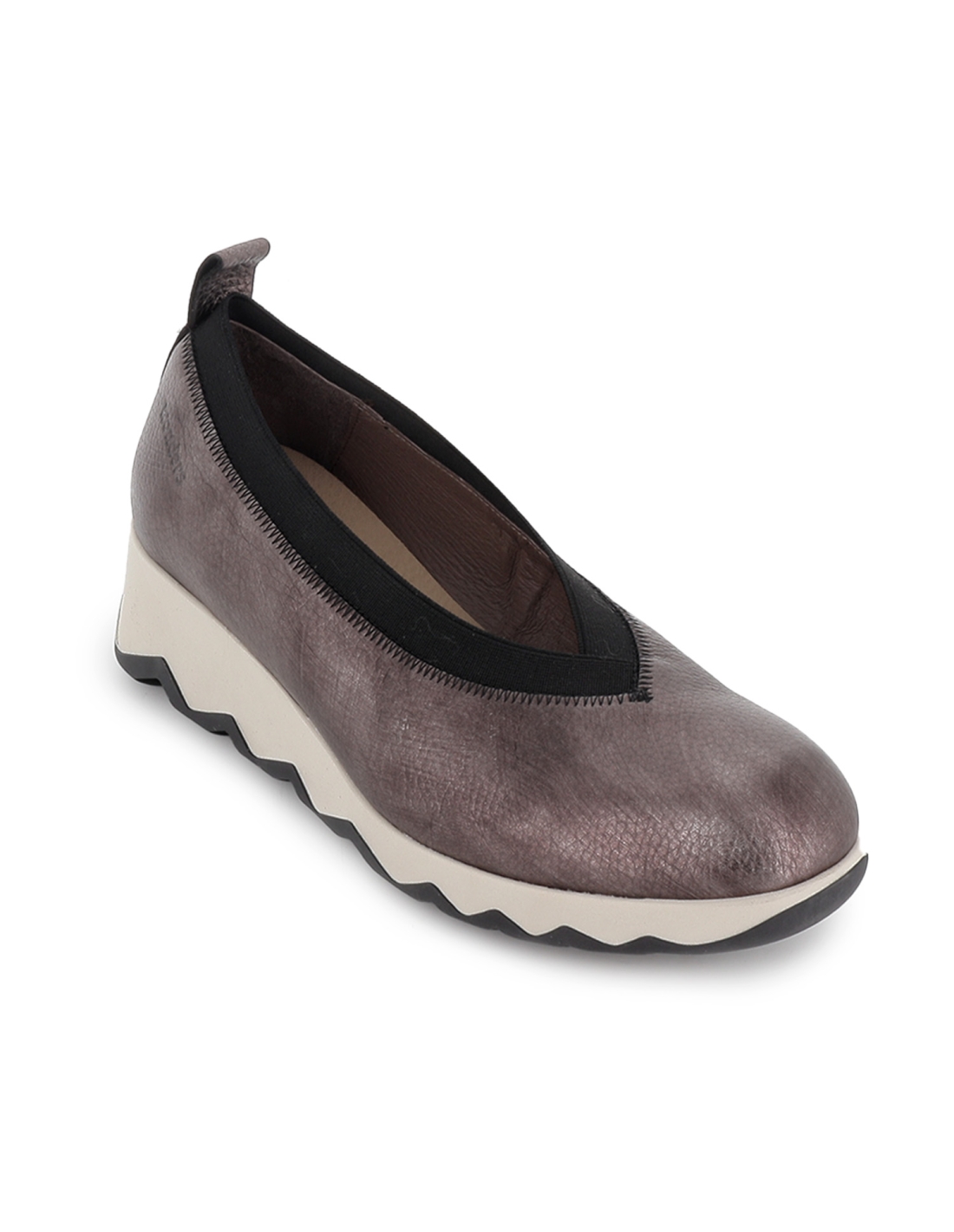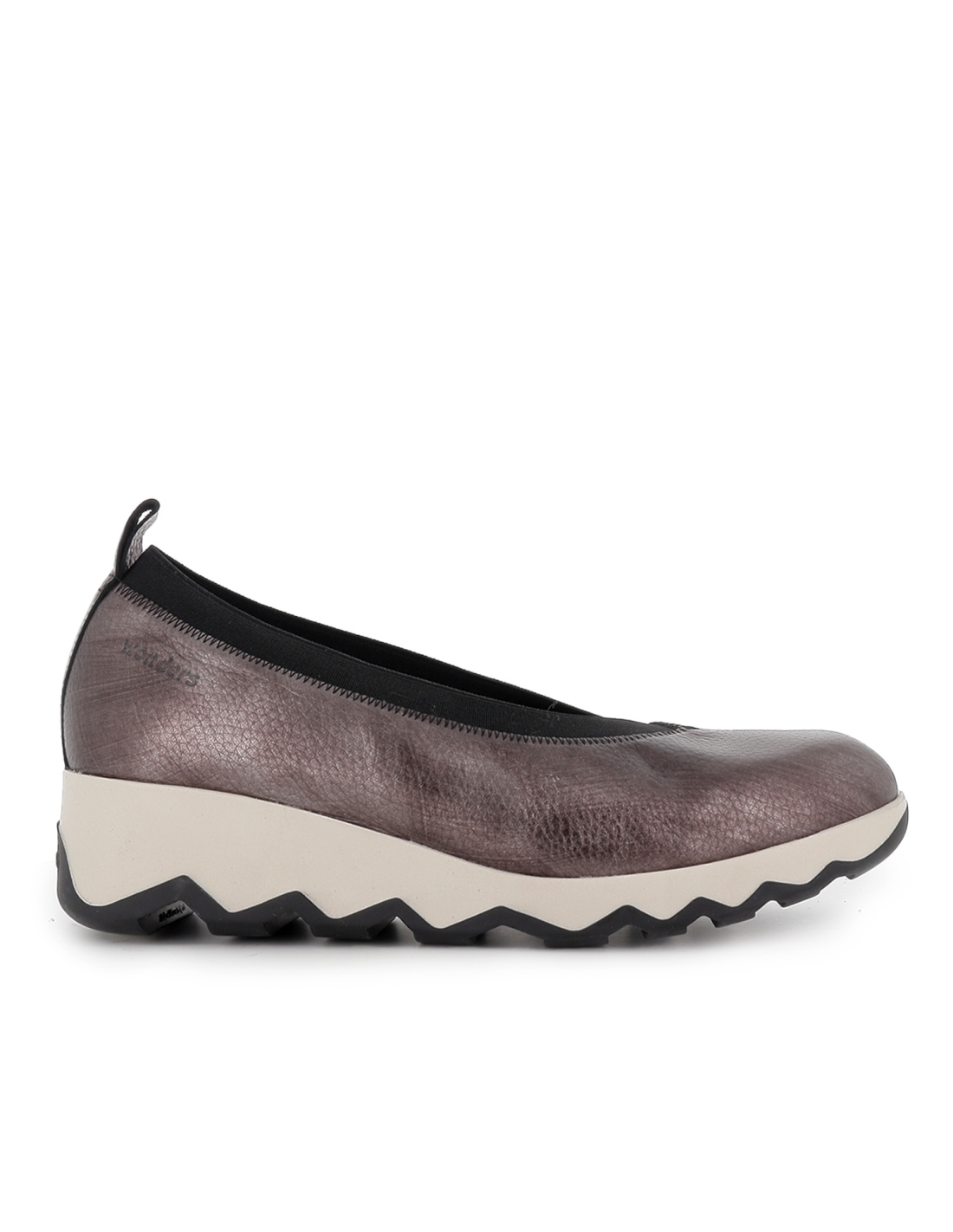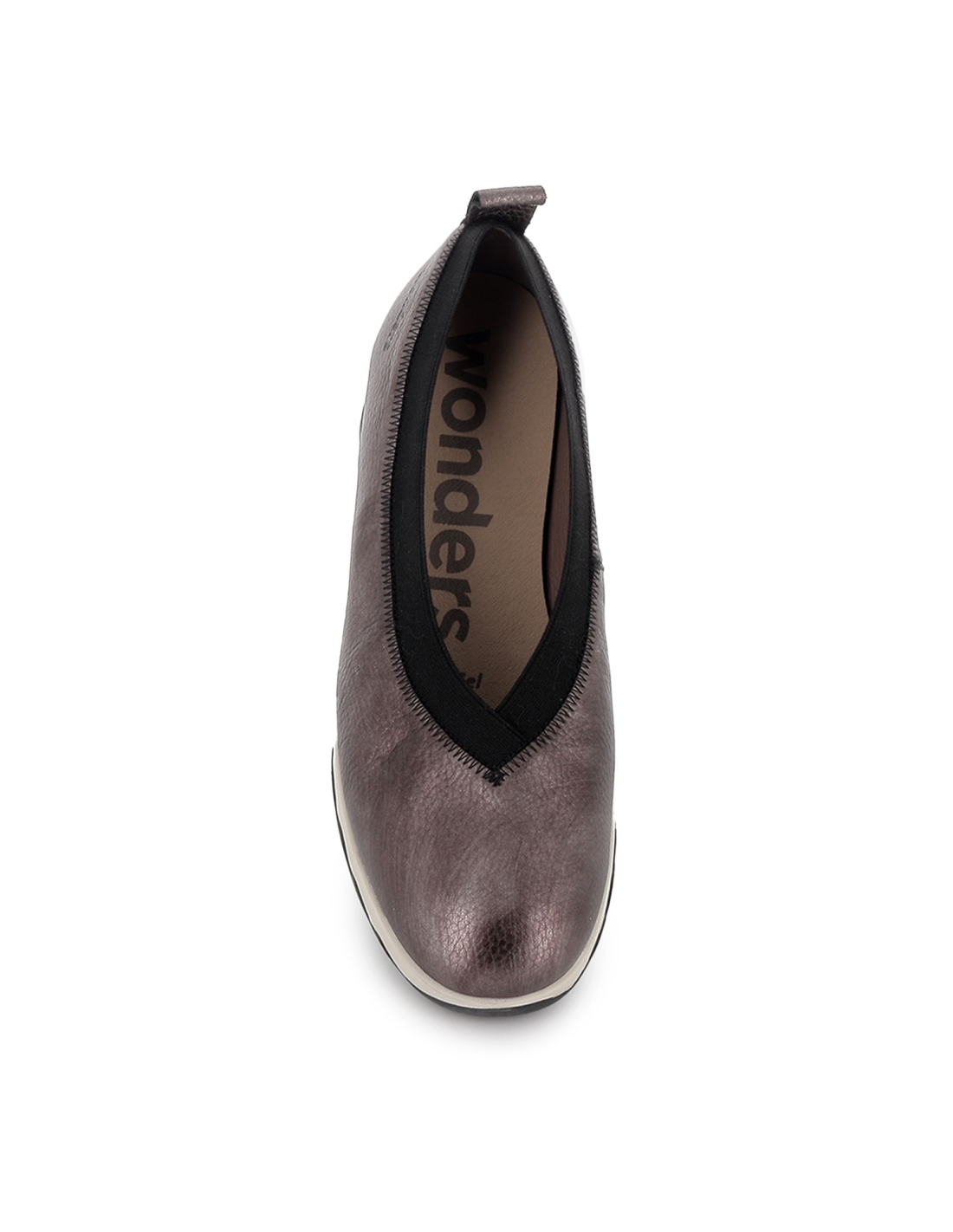 Bailarina piel con corte en V elasticos y cuña mujer plateado. Bailarina fabricada en piel tanto el forro como el exterior con corte en V rodeado de un elastico y suela de cuña. Suela de 4 cm de grosor. Plantilla de piel con MEMORY GEL (plantilla de gel con efecto memoria que no se deforma) una tecnología exclusiva para amortiguar la pisada. Piso de goma con cuña ligera y muy comoda. WONDERS es una marca que diseña y fabrica 100% en España. Sus zapatos son ligeros, ergonómicos, cómodos, resistentes y combinables para multitud de ocasiones de tu vida diaria. Sus valores se basan en la cuidar la calidad de los materiales y en la importancia de los trabajadores y de todos y cada uno de los procesos que intervienen en la creación del calzado.