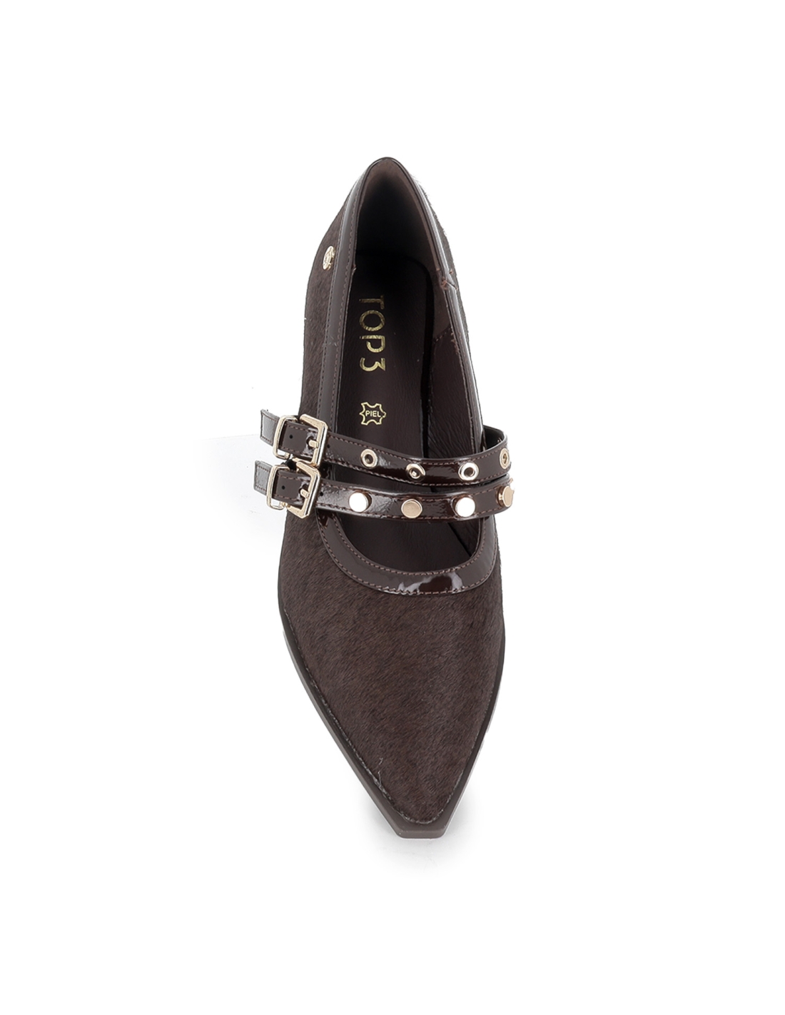 Bailarina vestir piel con doble correa plana mujer marron. Bailarinas de vestir clasico fabricada en piel pelo potro con ajuste mediante dos tiras ajustables en el empeine. Suela plana de goma flexible con puntera almendrada. Modelo facilmente combinable. TOP3 SHOES es una marca de calzado española que aboga por la comodidad, estilo actual y naturalidad en sus diseños. Calzado comodo, con colores tierra muy combinables y de estilo propio, para mujeres de todos los estilos y edades que busquen moda y confort.