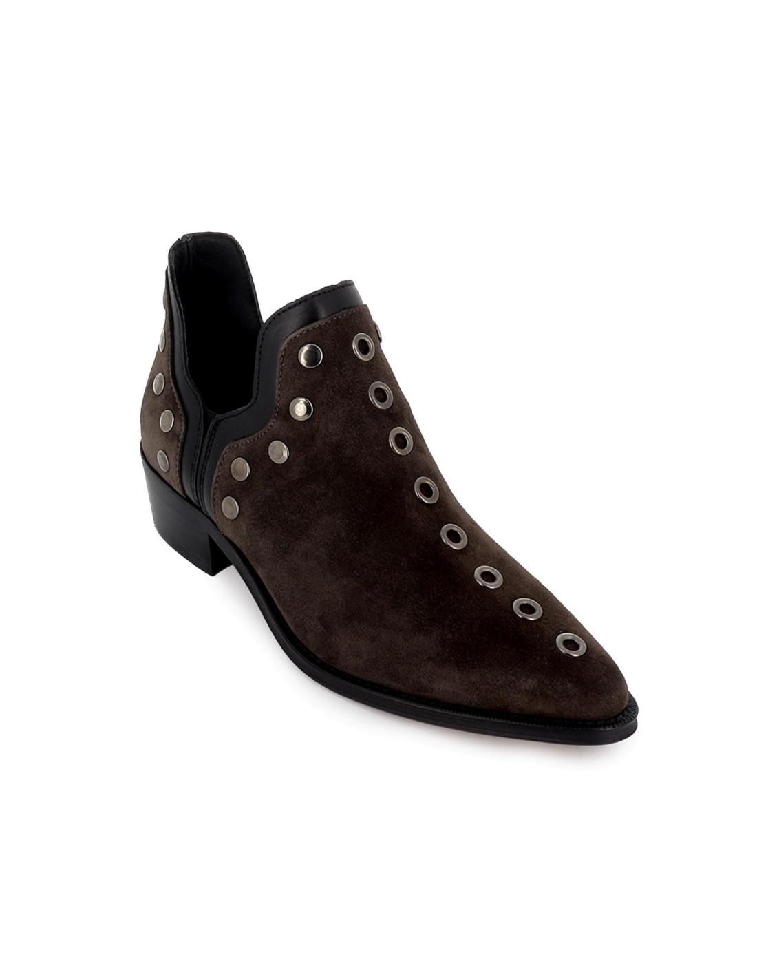 Botines abiertos piel diseño tachas con tacon 4 cm mujer gris. Botín fabricado en piel serraje y detalle vivo. Este botín tiene aberturas laterales a la altura de los tobillos y tachas decorativas alrededor con un estilo que esta muy en tendencia esta temporada. Punta fina y tacón de 4 cm de efecto madera. Un zapato que te acompaña en multiples planes esta temporada. ALPE es una marca de calzado que diseña y fabrica 100 % en España. Llevan más de 30 años fabricando calzado cómodo, de gran calidad, a la moda y a un precio excepcional. Prestan atención a cada detalle del proceso de creación del calzado, desde el corte de las pieles hasta el último acabado, todo de forma artesanal para ofrecer un zapato de calidad inigualable.
