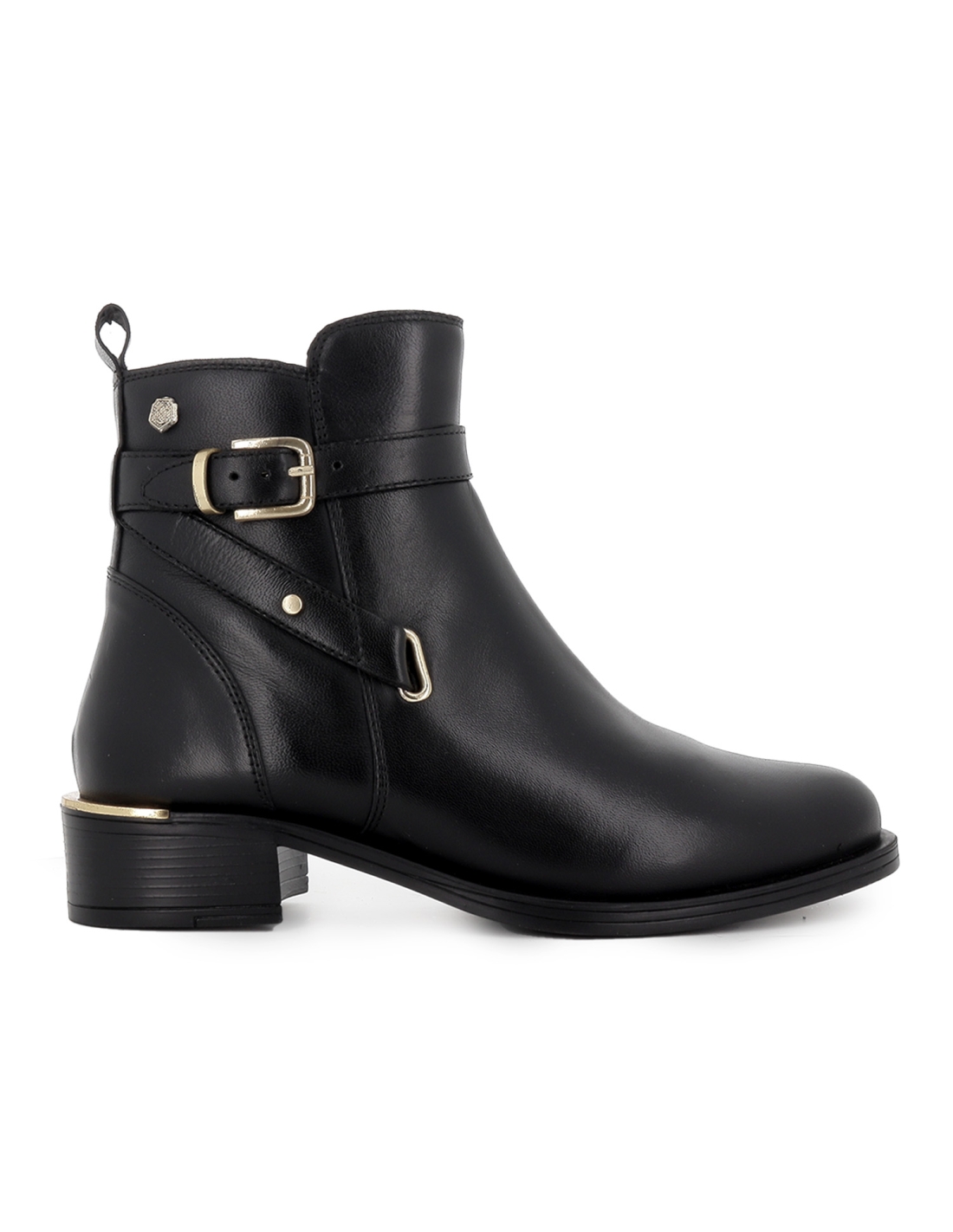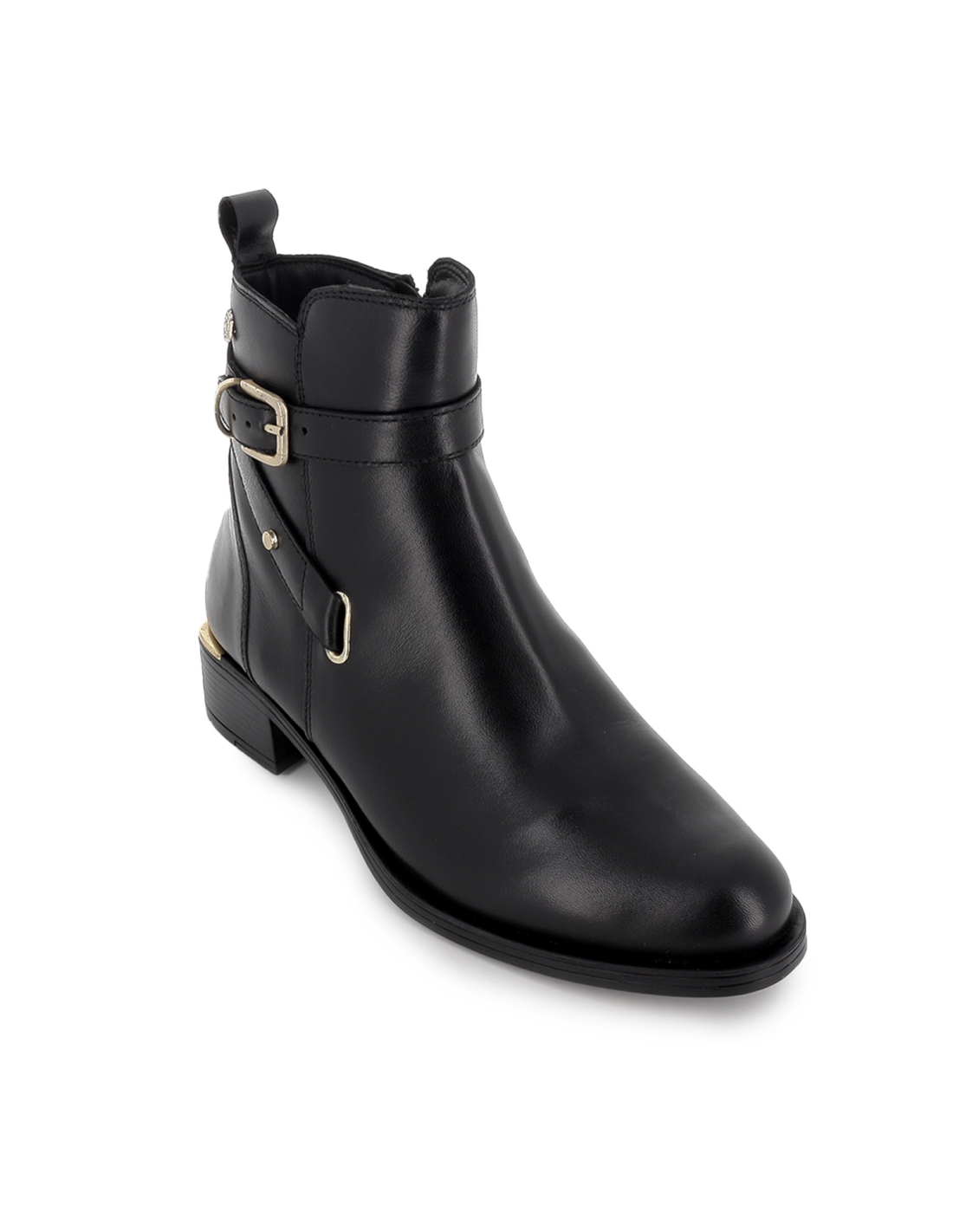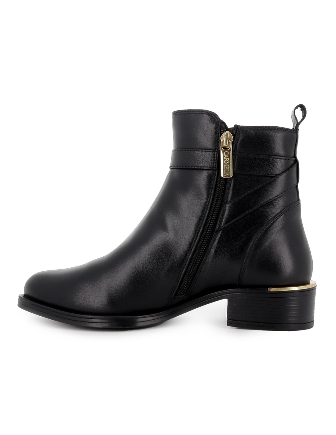 Botin piel correas con cremallera tacon bajo mujer negro. Botin fabricado en piel lisa de crte irregular con detalle de correa con hebilla rodeando el tobillo y cierre mediante cremallera interna. Botín con tacón de altura baja, y suela de goma antideslizante. Son unos zapatos perfectos para darle fuerza a tus looks. CARMELA es una marca nacional que diseña y fabrica en España. Son expertos en calzado de piel calidad, realizados de forma artesanal con materiales nobles, con personalidad, que siguen las últimas tendencias y que se adaptan al pie a la perfeccion. Su lema es: Lo trendy también puede ser comodo.