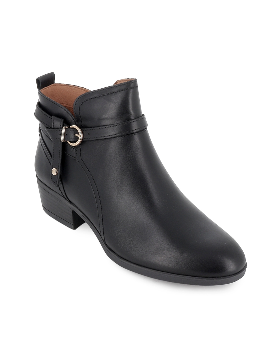 Botin piel corte irregular y hebilla tacon bajo mujer negro. Botin fabricado en piel de corte irregular con detalle de hebilla y cinta anudada alrededor del tobillo y cierre mediante cremallera interior. Suela de goma antideslizante y tacon ancho de baja altura. La combinacion perfecta para cualquiera de tus looks. PIKOLINOS es una marca que destaca por su esfuerzo en crear un calzado auténtico, de calidad, con diseños únicos y realizados con los mejores materiales naturales. Sus modelos exclusivos están diseñados en España, y son referentes en su campo, siendo esta marca garantía de calidad, elegancia y comodidad.