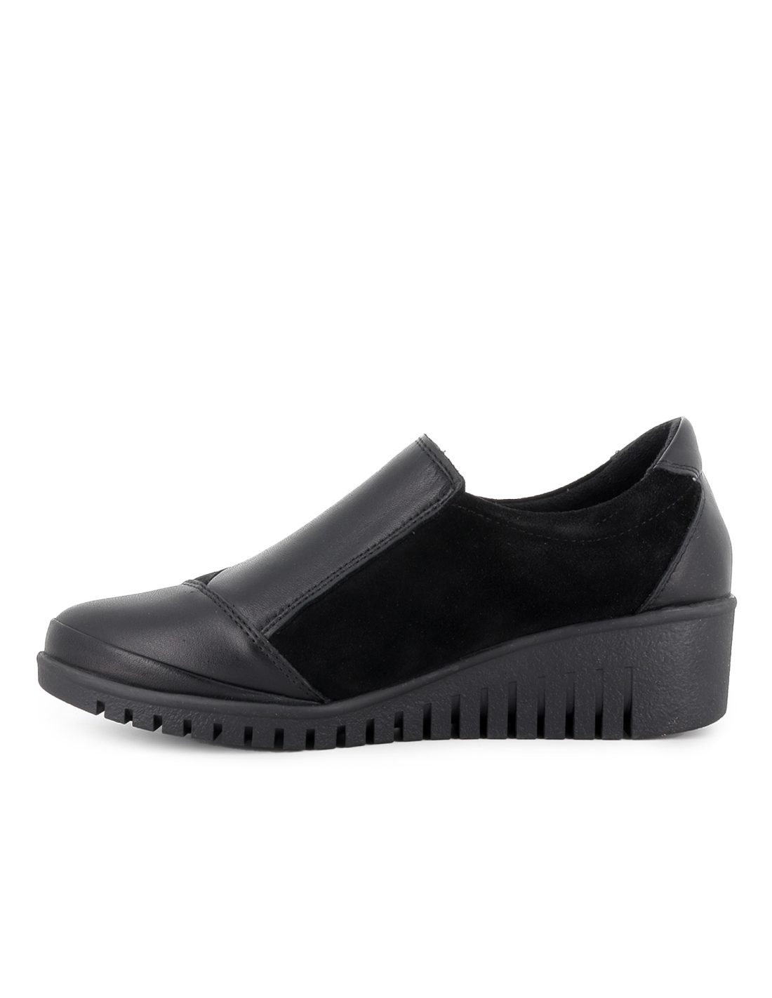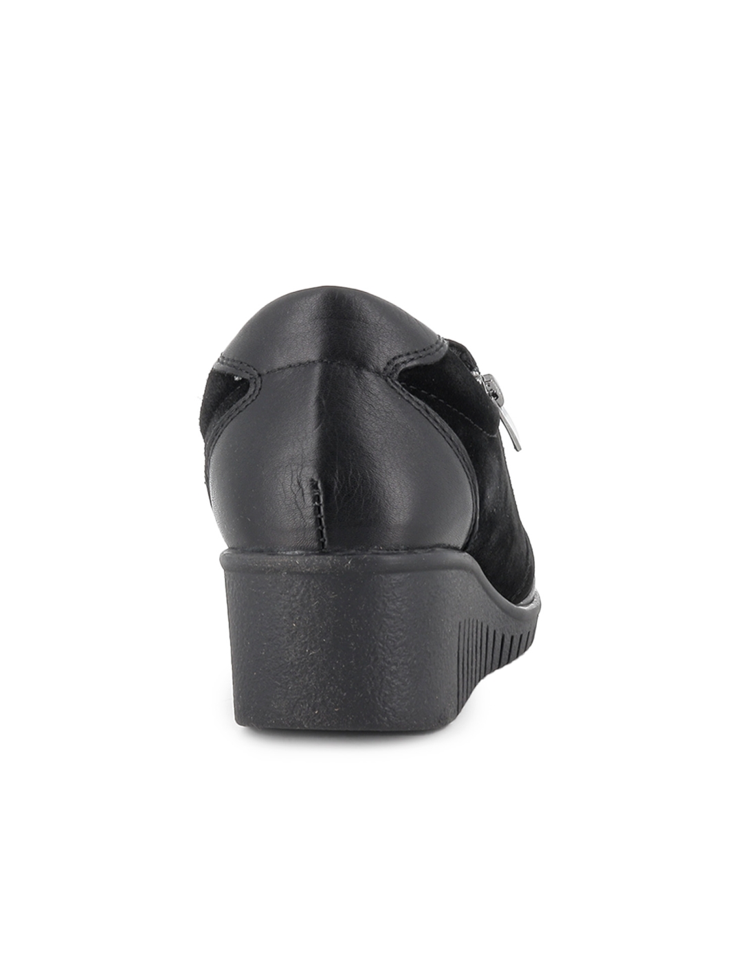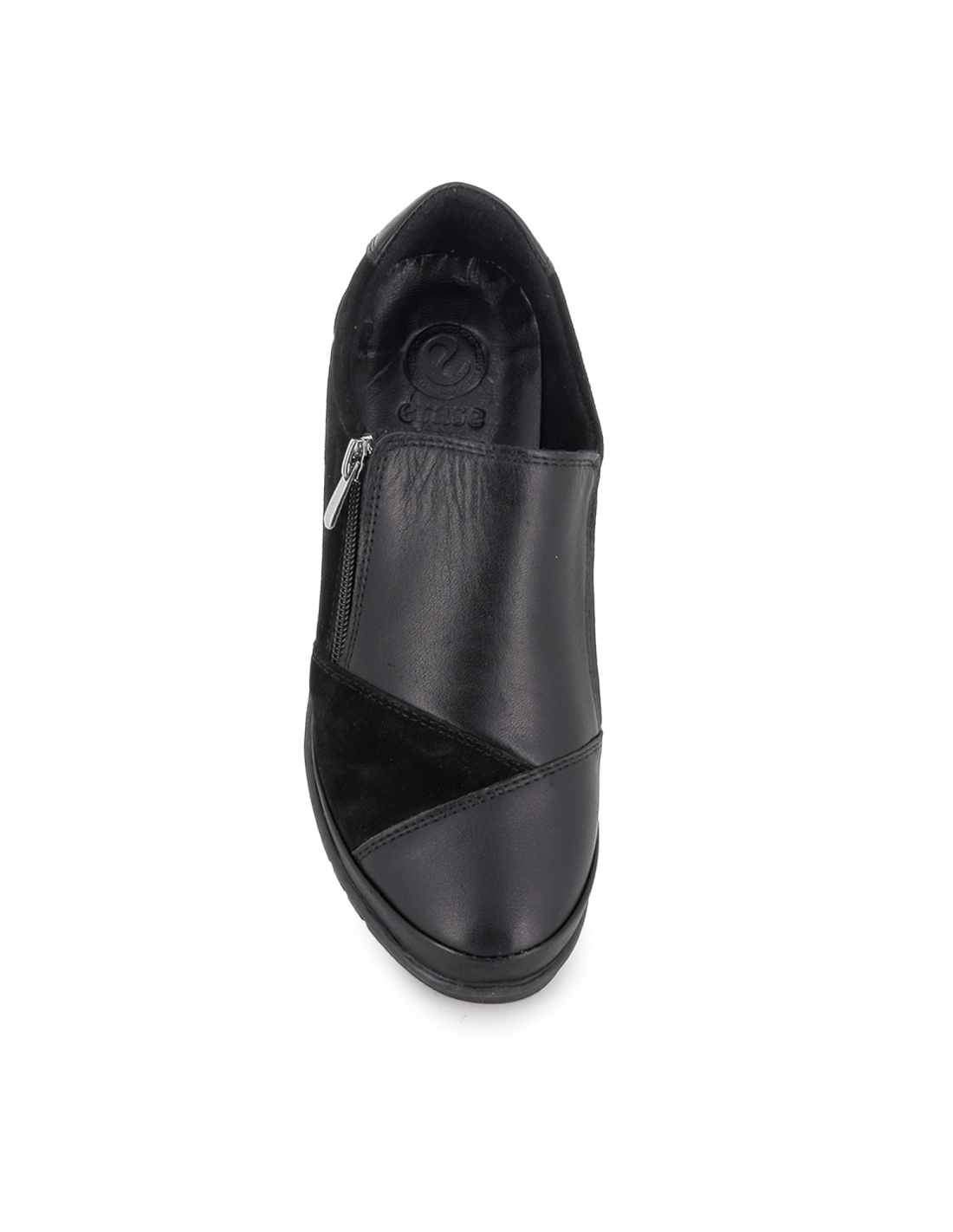 Botin piel y serraje cremallera comodo cuña mujer negro. Botin fabricado en piel lisa combinado con serraje, ambos tipos de primera calidad con cierre mediante cremallera lateral. Zapato de cuña ligera, este modelo destaca por su comoda horma, perfecta para tus planes de la temporada. Resulta un zapato de máxima calidad que destaca por el confort de su horma. Fabricación artesanal en España. ERASE es una marca de calzado española. Entre sus valores principales están el uso de pieles de calidad superior y la defensa del medio ambiente. Quien usa un calzado ERASE sabe que calza calidad, confort y ética con unos diseños únicos.