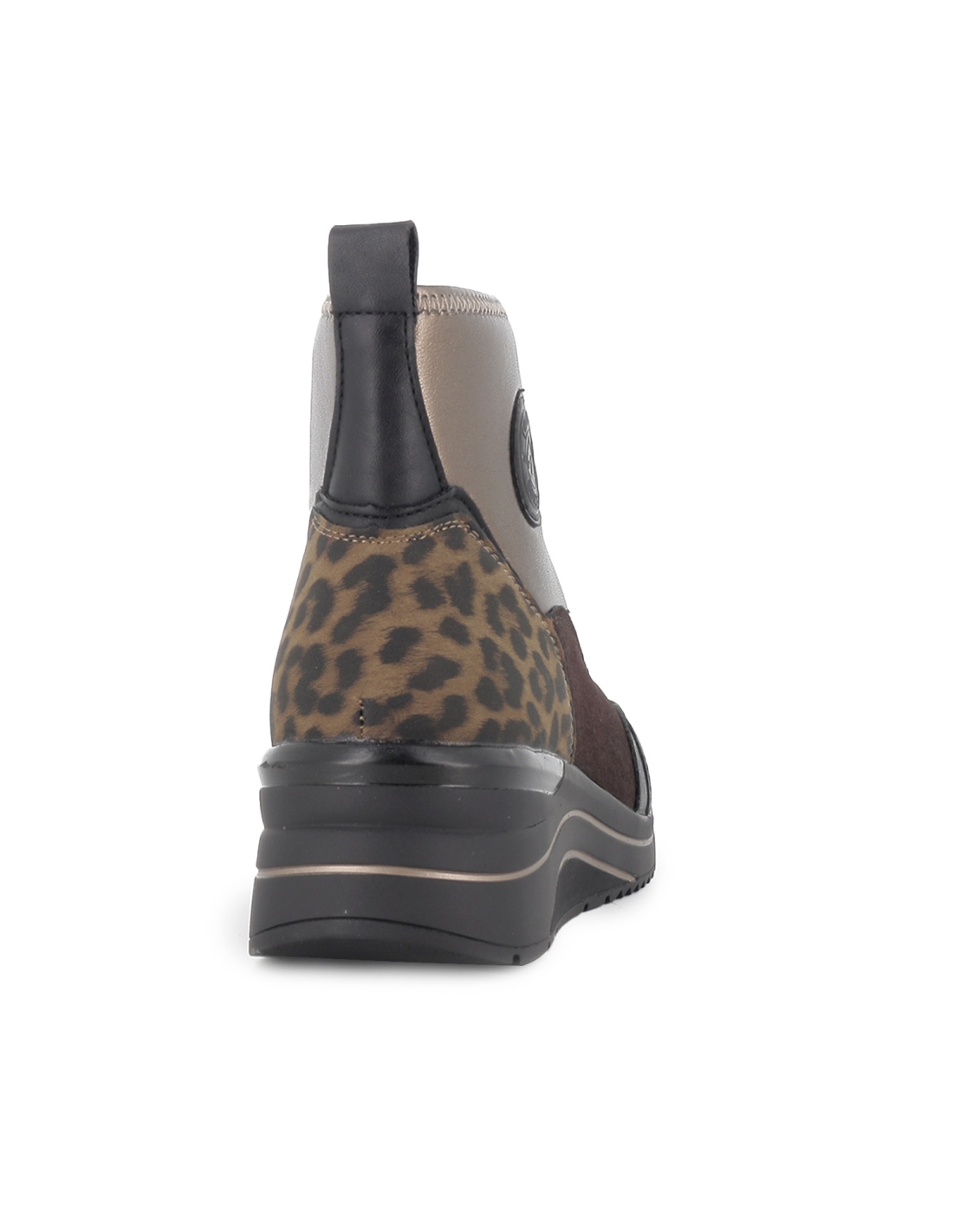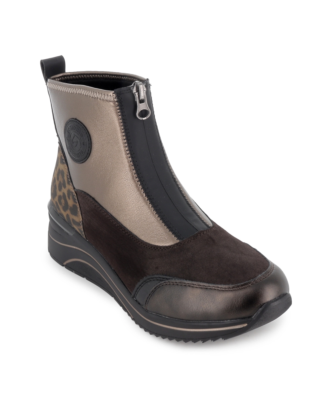 Botin piel elastica vegana cremallera cuña mujer dorado. Botin fabricado en piel elastica y vegana combinado en diferentes acabados con diseño de caña alta y con animal print en el talon y cierre mediante cremallera central. Suela de cuña de unos 5,5 cm con plantilla comoda y extraible. Zapato que destacan por su comodidad, perfectas para acompañar tus REMONTE es la línea más juvenil de RIEKER, una reconocida marca de calzado alemana que se especializa en zapatos cómodos que cuentan con una exclusiva tecnología anti-stress, es decir, que absorbe el impacto de la pisada. Calzado de gran calidad, cómodo y genuino.