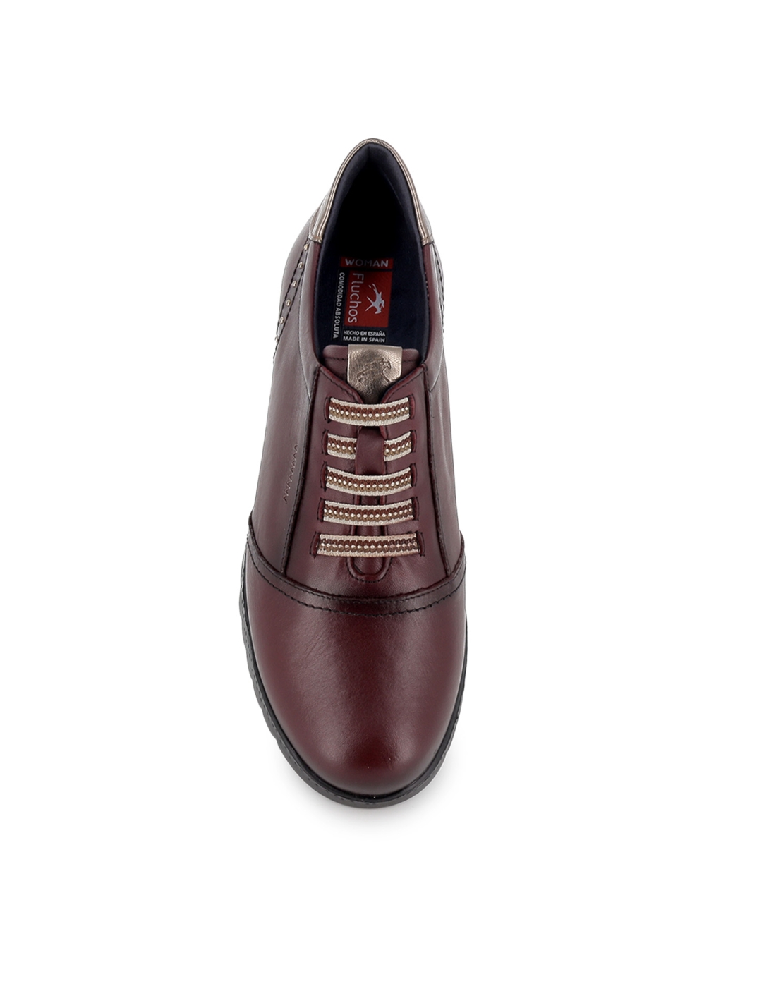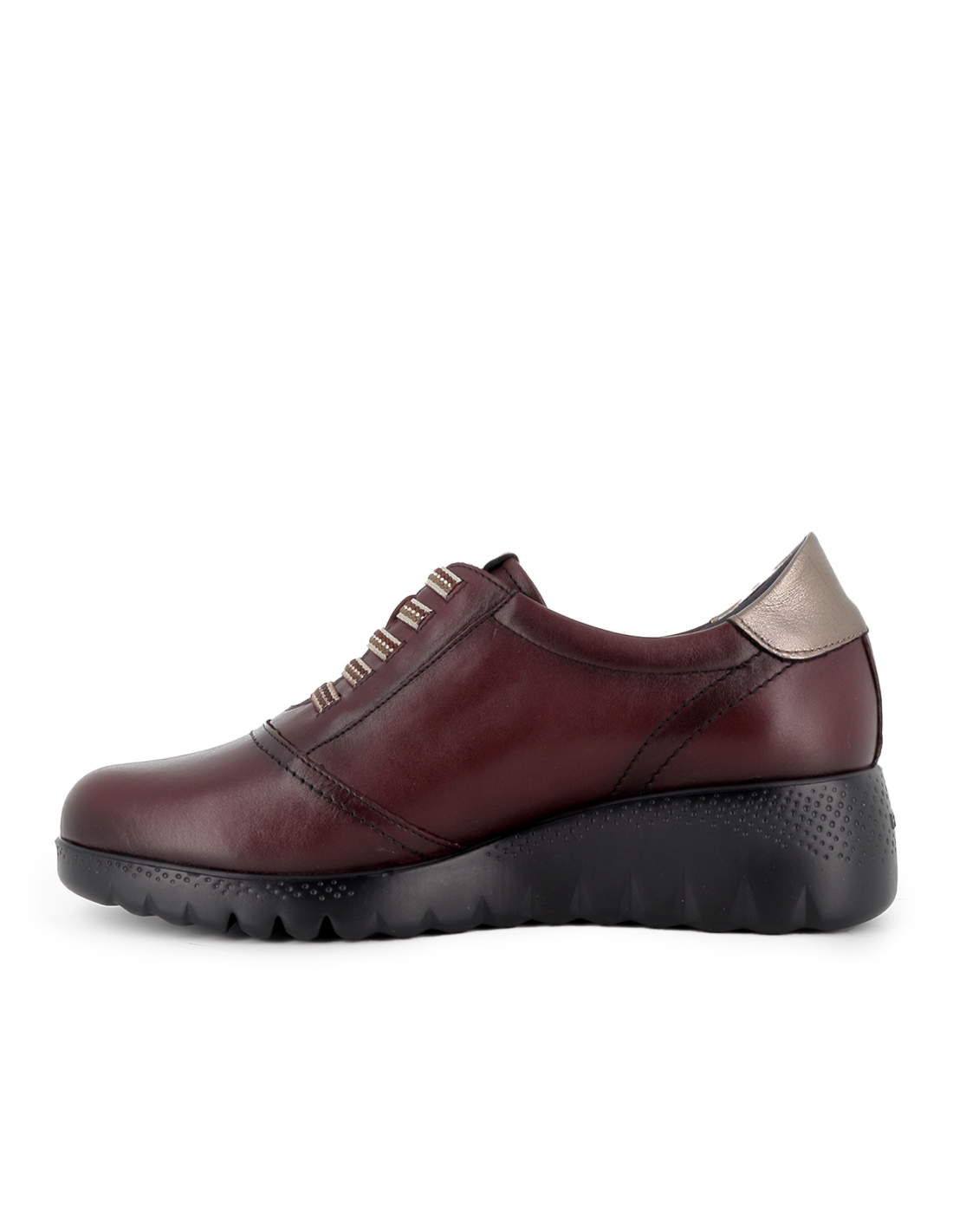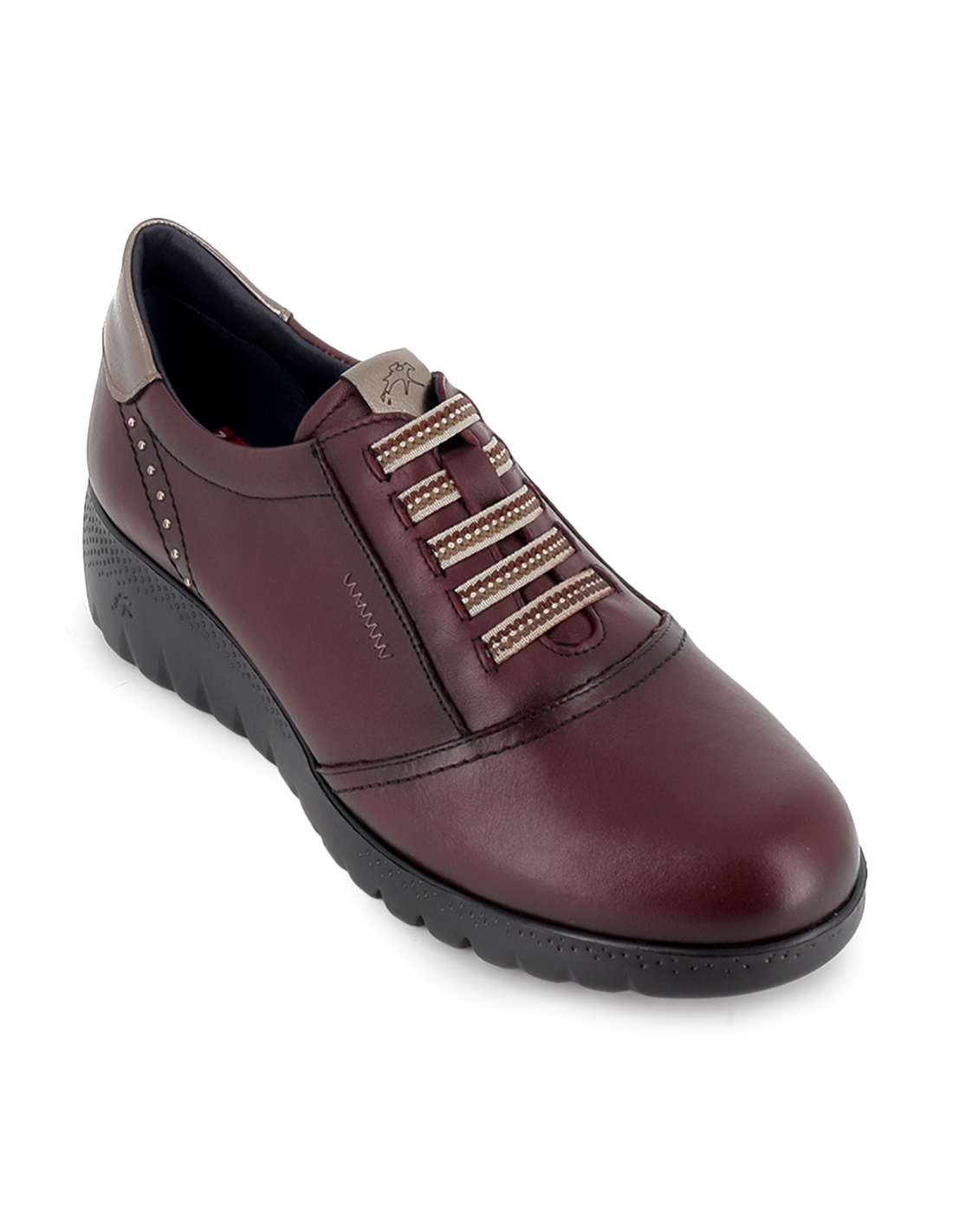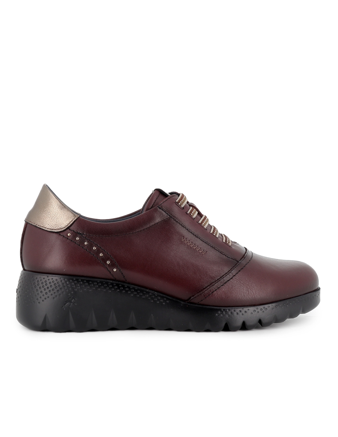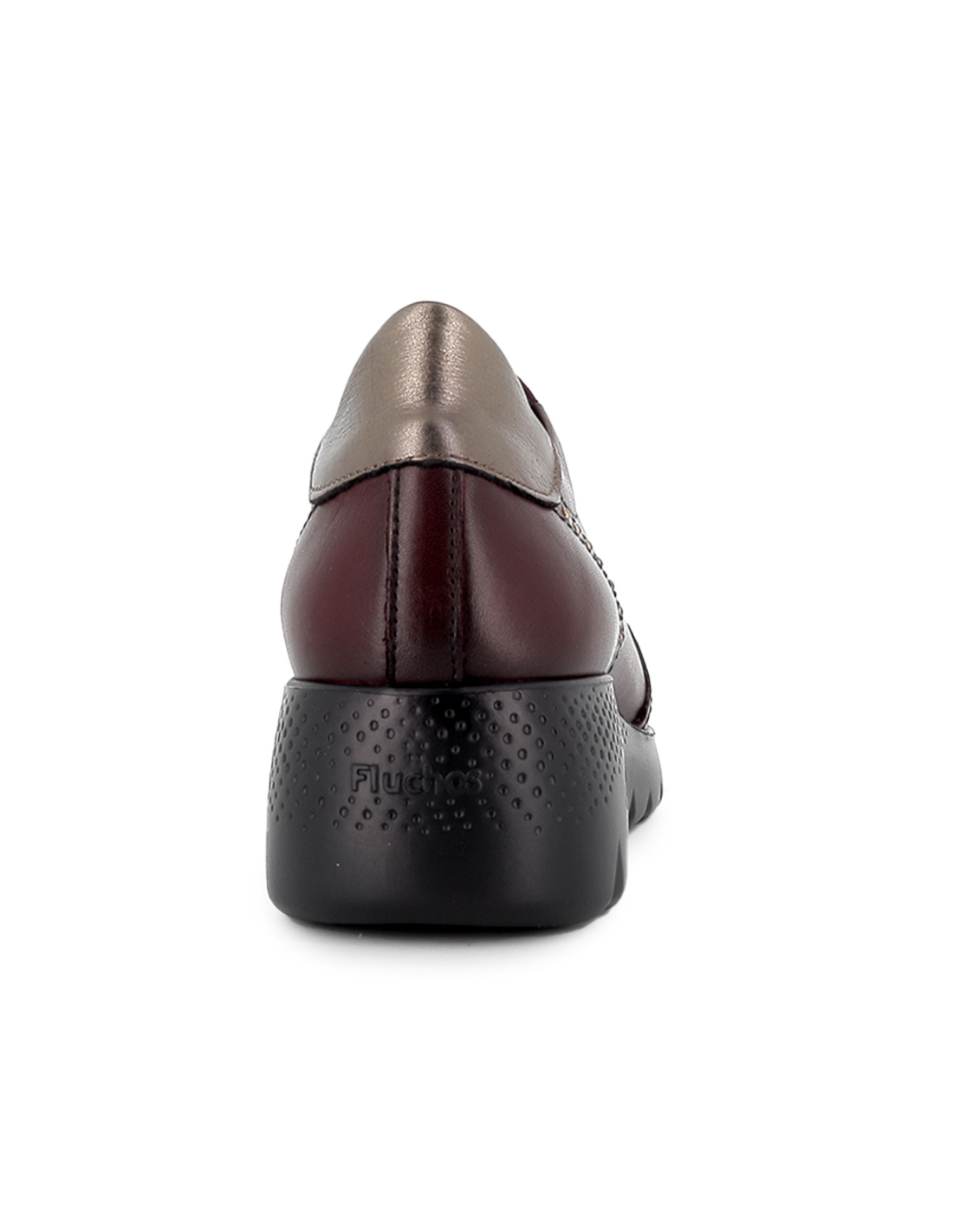 Deportivos piel cordones elásticos cuña mujer burdeos. Zapatos de estilo deportivos fabricados en piel lisa de primera calidad y con detalle de piel metalizada en el talon. Deportivas muy en tendencia con ajuste mediante elasticos. Suela de cuña ancha. Unos zapatos con el que seras el centro de miradas sin perder comodidad. FLUCHOS es una marca española líder en el mercado internacional. Sus estandartes son ofrecer un calzado cómodo, de calidad y 100 % HECHO EN ESPAÑA, que incluyan las tecnologías más avanzadas, como Air System Fluchos, Shock Absorber y Air Confort System. Todo para conseguir un calzado más ligero, que regule la temperatura, impermeable y flexible.