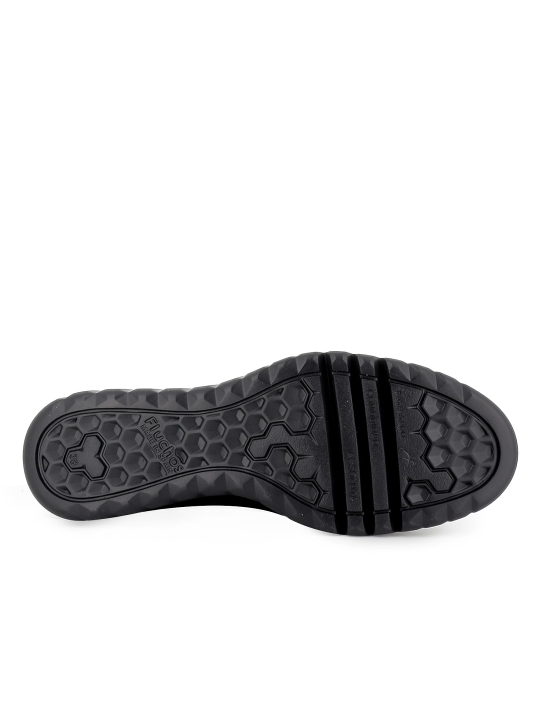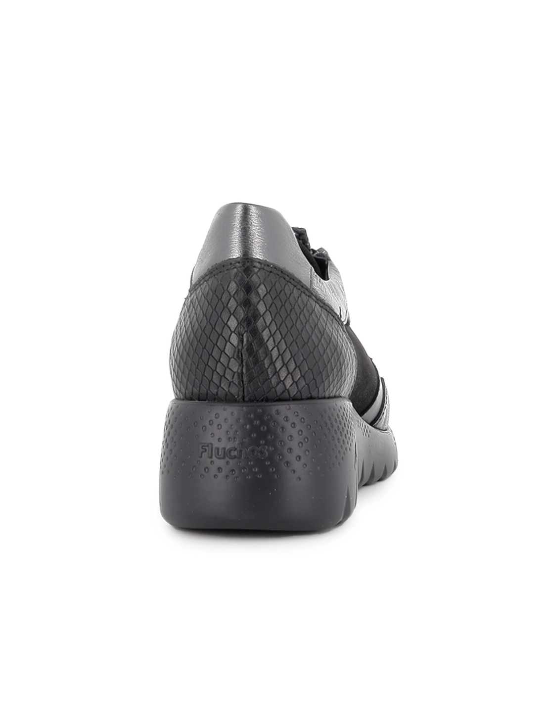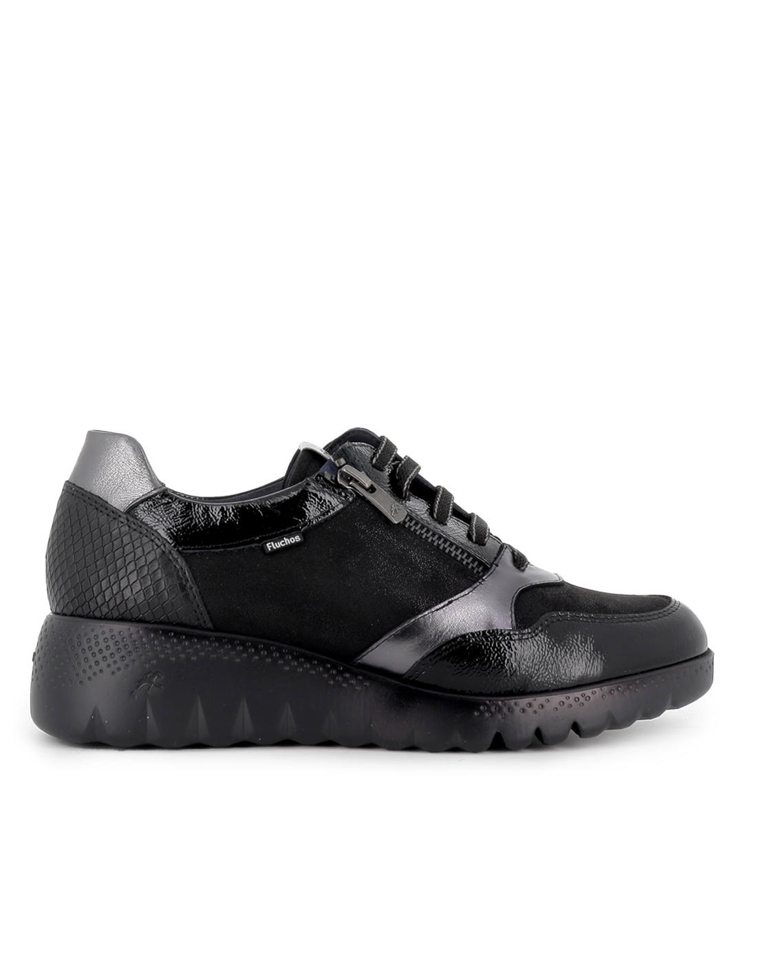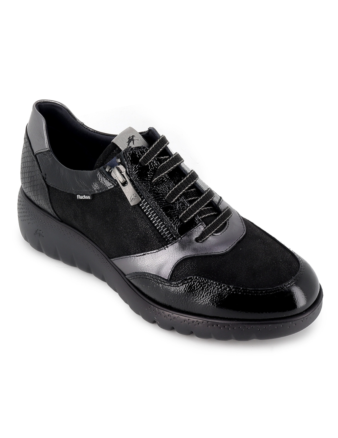 Deportiva piel combi con cremallera y cordones cuña mujer negra. Deportivas fabricado en piel de diferentes acabados, tanto lisa como serraje como animal print, combinado con charol. Cierre mediante cordones y cremallera. Suela cuña media ultraligera formada con goma dentada y resistente. Zapato perfecto para uso diario. FLUCHOS es una marca española líder en el mercado internacional. Sus estandartes son ofrecer un calzado cómodo, de calidad y 100 % HECHO EN ESPAÑA, que incluyan las tecnologías más avanzadas, como Air System Fluchos, Shock Absorber y Air Confort System. Todo para conseguir un calzado más ligero, que regule la temperatura, impermeable y flexible.