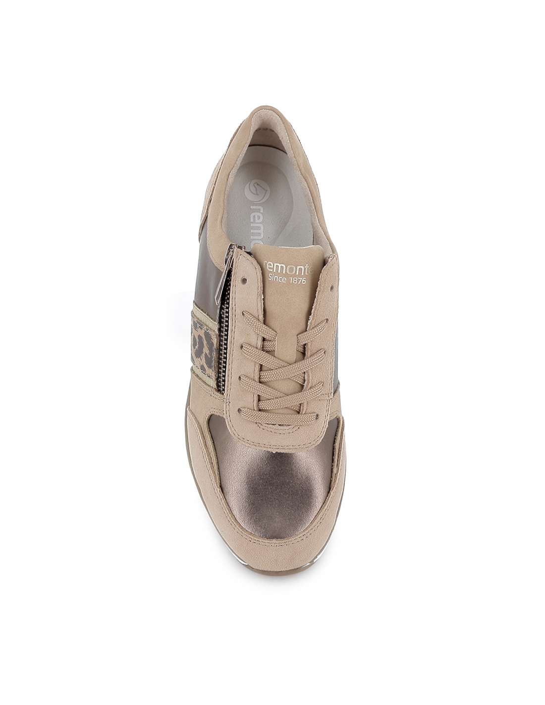 Deportivas piel cordon y cremallera con plantilla mujer beige. Deportivas fabricado en piel con diseño leopardo lateral y cierre mediante cordon y cremallera para mayor ajuste. Lleva una plantilla acolchada y extraible con una ligera cuña. Zapatos en tendencias perfectos para combinar todos tus looks. Además es perfecto para todo tipo de clima ya que su sistema TEX protege del viento, del frío y de la lluvia. Incluye plantilla acolchada y extraíble. Perfectos para los looks de diario. REMONTE es la línea más juvenil de RIEKER, una reconocida marca de calzado alemana que se especializa en zapatos cómodos que cuentan con una exclusiva tecnología anti-stress, es decir, que absorbe el impacto de la pisada. Calzado de gran calidad, cómodo y genuino.