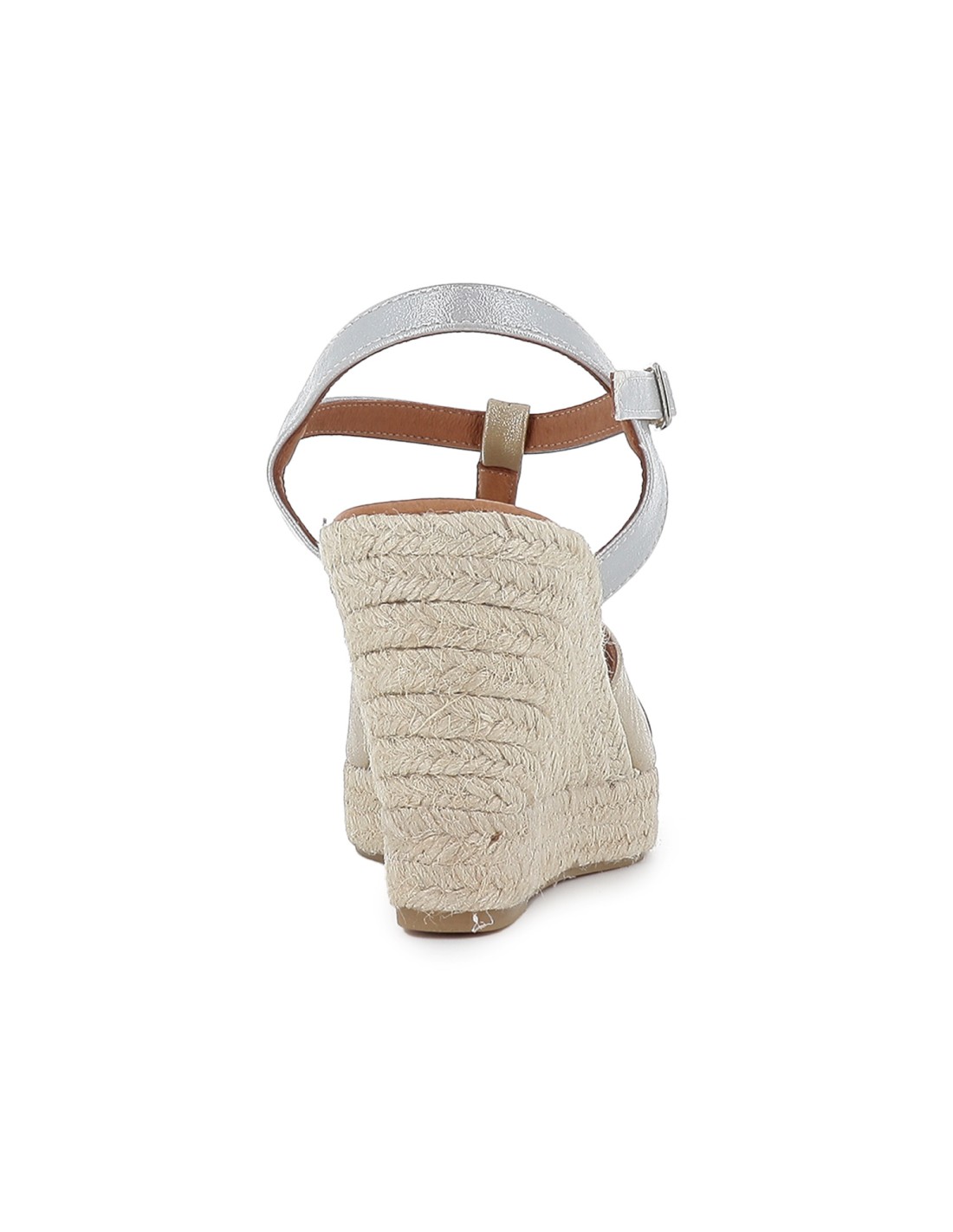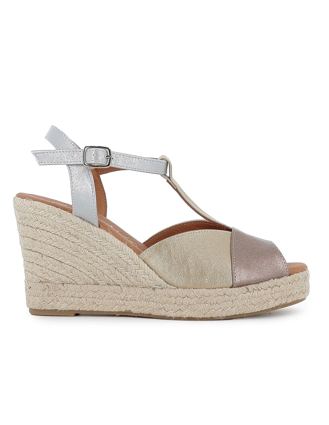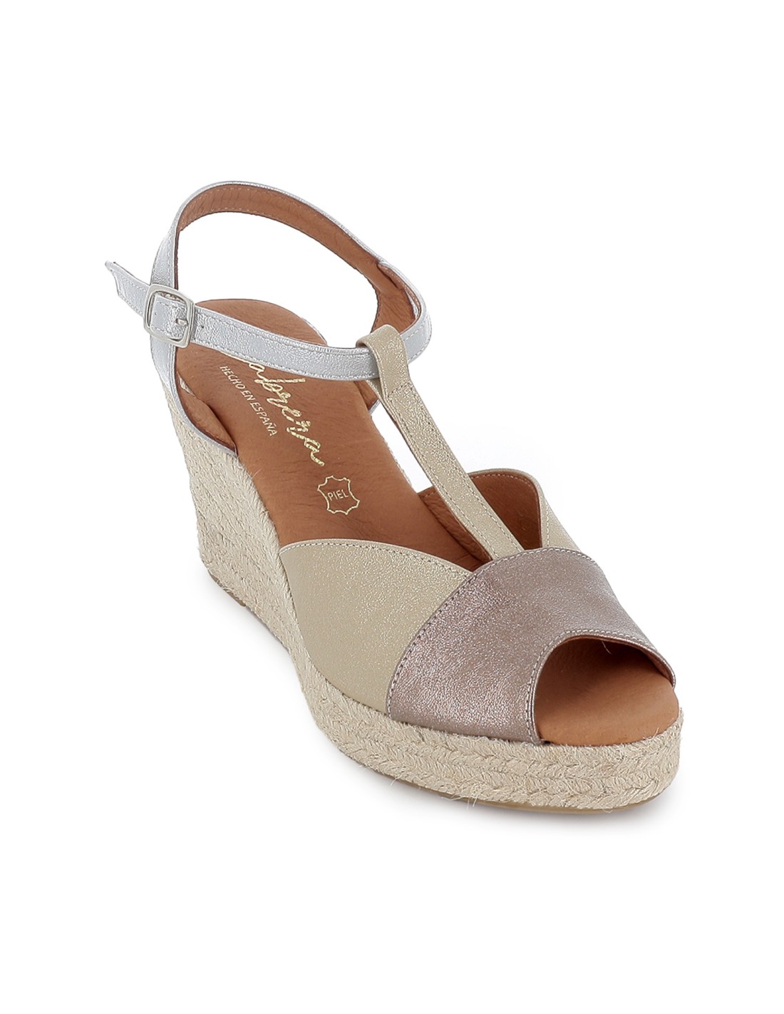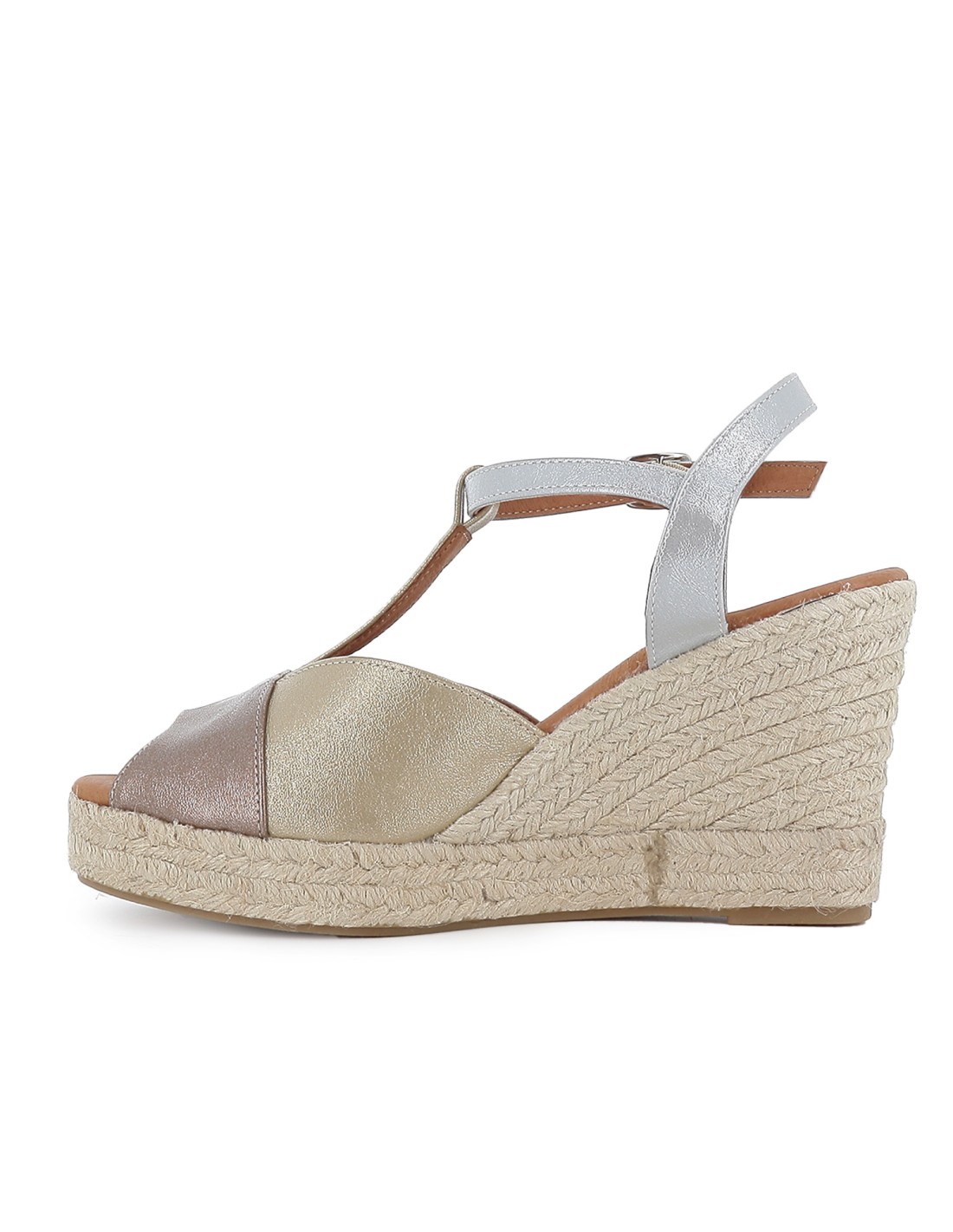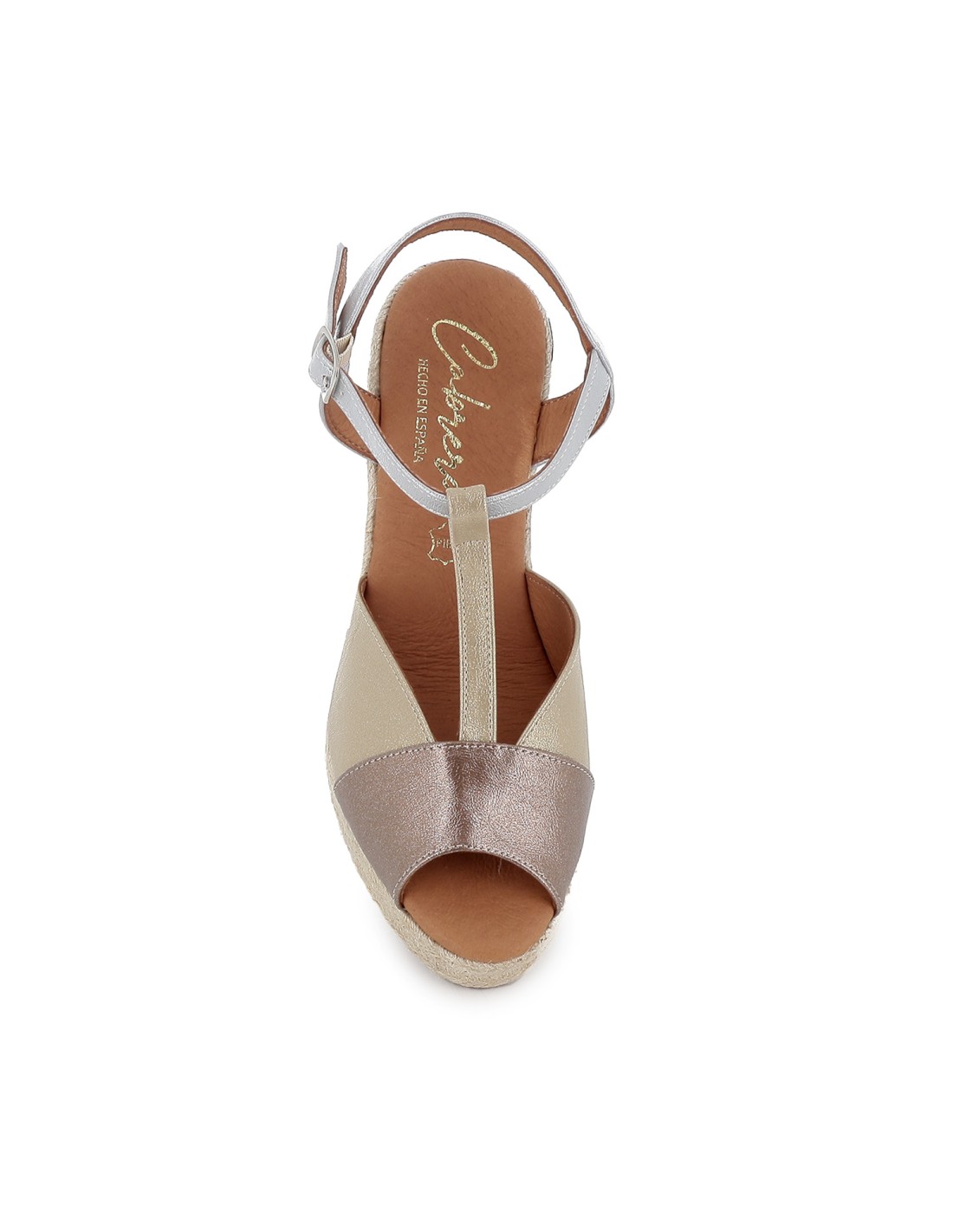 Sandalia plataforma yute napa forrada mujer dorada. Alpargatas tipo sandalia con suela yute fabricada en napa con 3 tonos metalizados forrada de piel con cierre mediante tira con hebilla a modo de pulsera en el tobillo. Plantilla de piel acolchada para un extraconfort que resulta muy comoda. Calzado basico para tu armario. Cabrera es una marca de fabricación española, concretamente ubicada en Elche, centrada en calzado de mujer de estilo tradicional y que su insigna de diferenciación es el uso del yute de alta calidad y la fabricación artesanal, haciendo que cada pieza sea única.