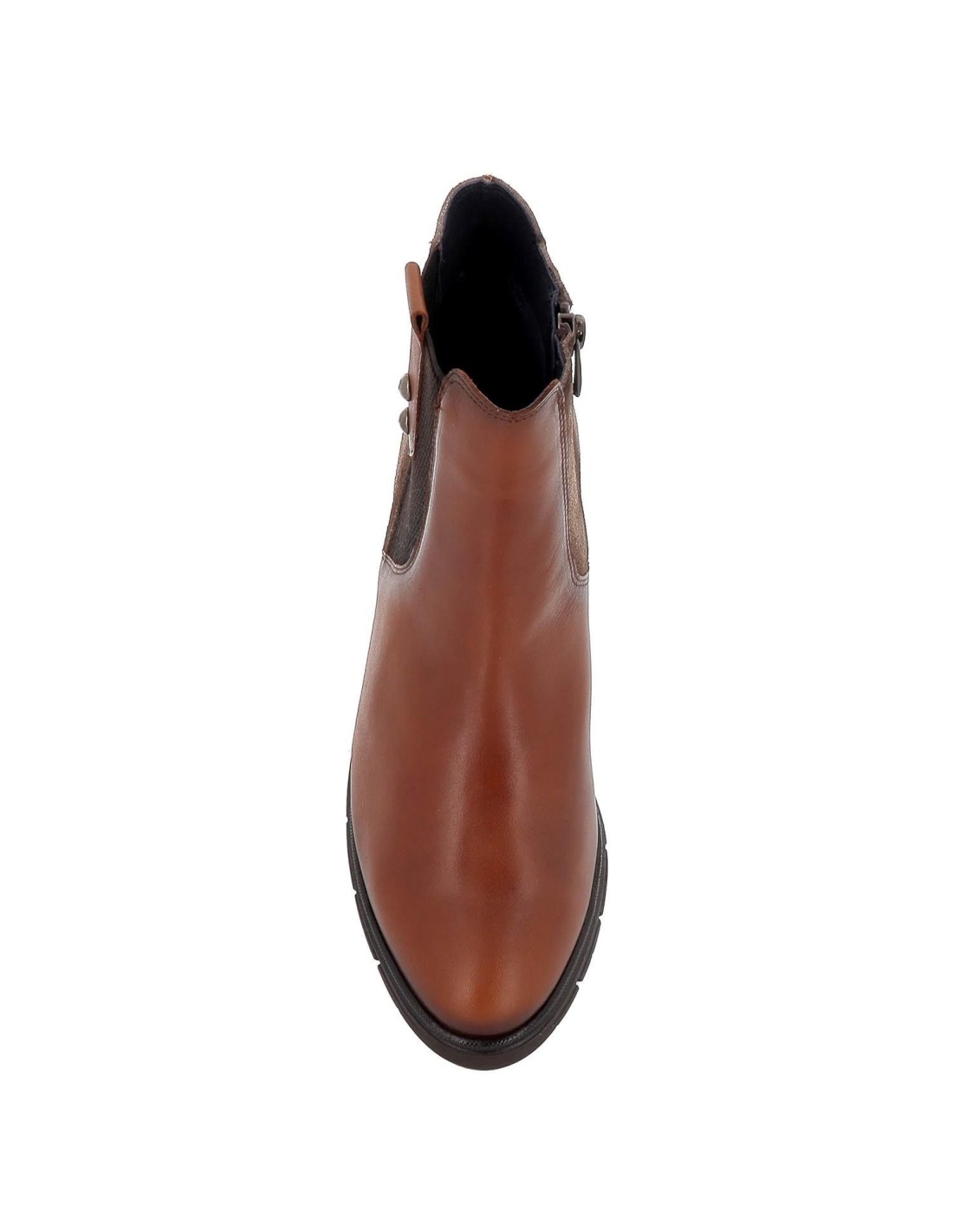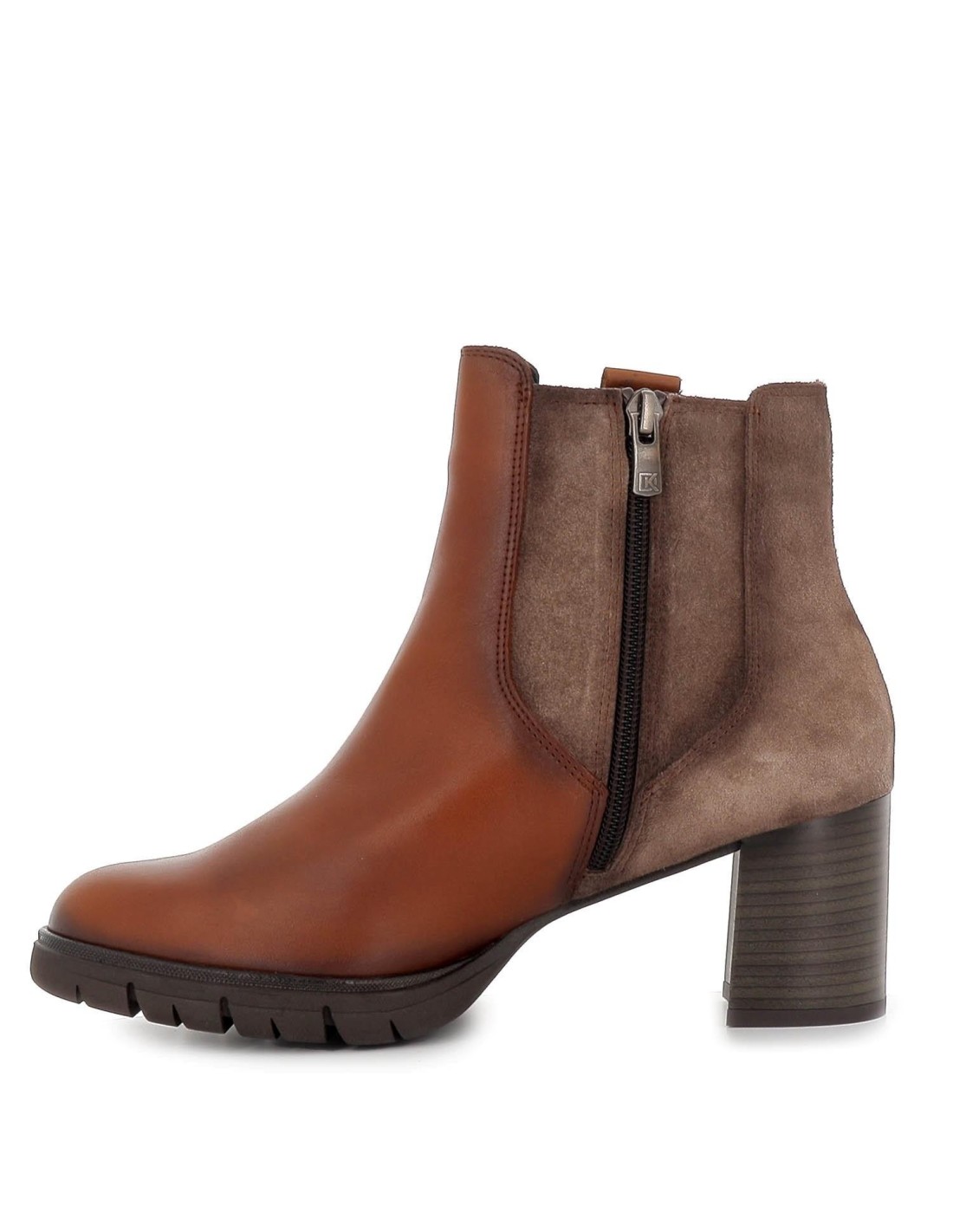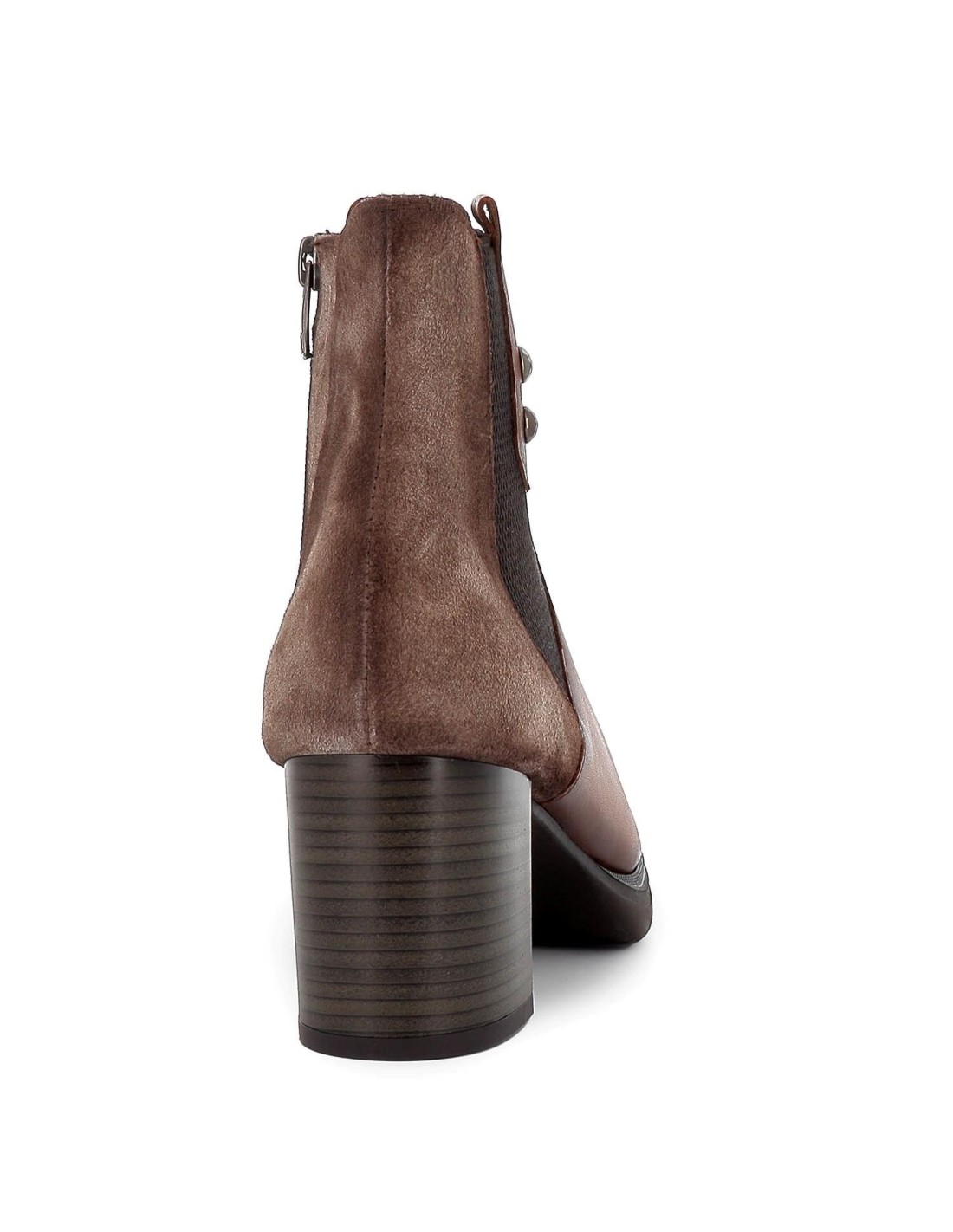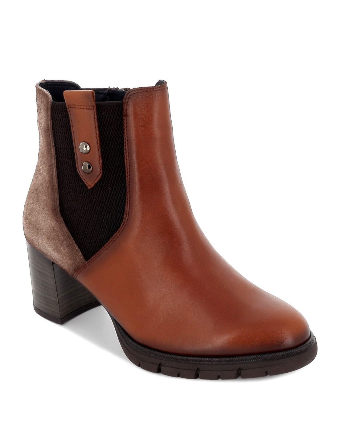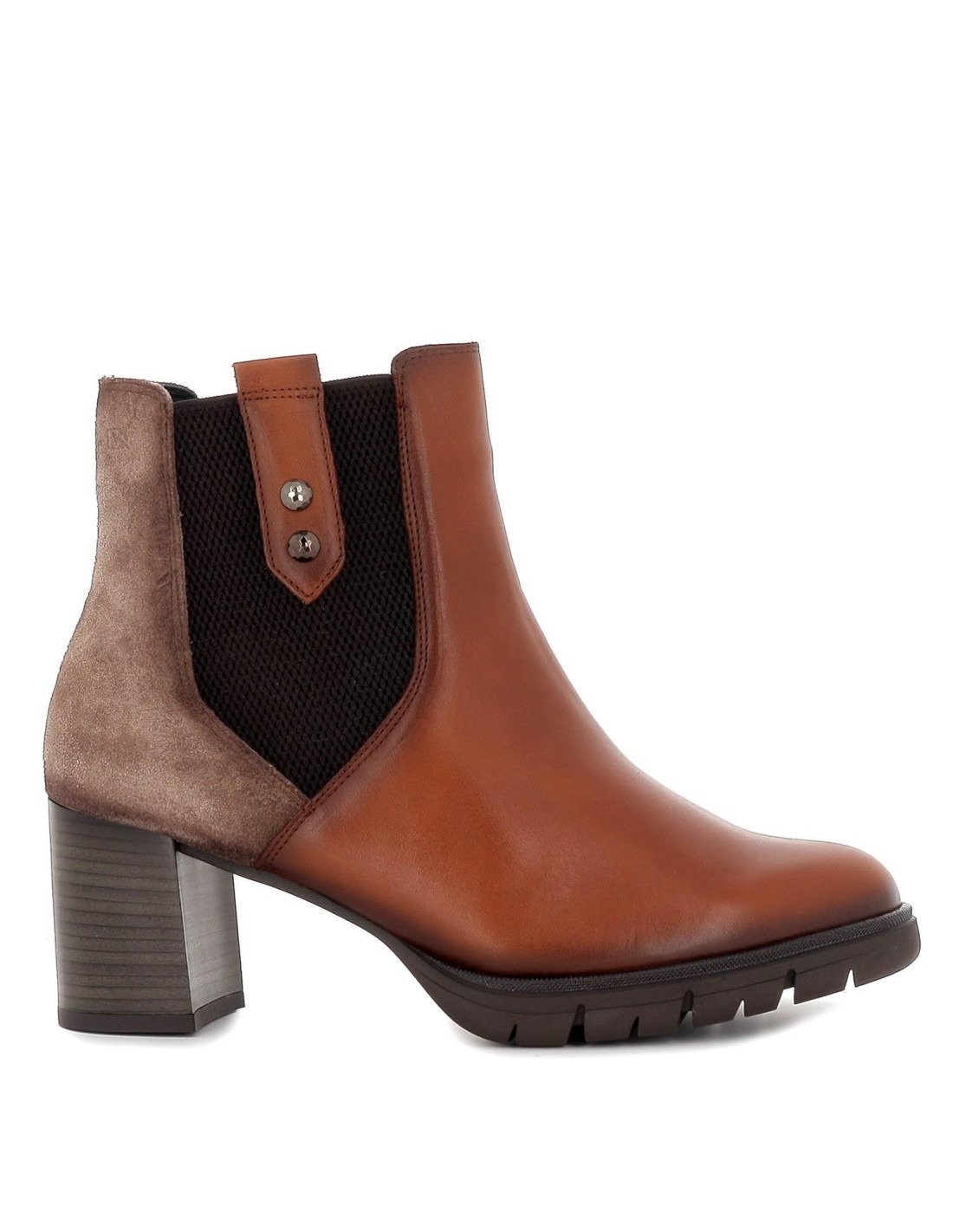 Botín elástico tacón piel marrón. Botín fabricado en piel de calidad superior con detalle de elásticos laterales y tacón efecto madera. Suela de goma flexible y plantilla acolchada incorporada para garantizar la comodidad que caracteriza a esta marca.