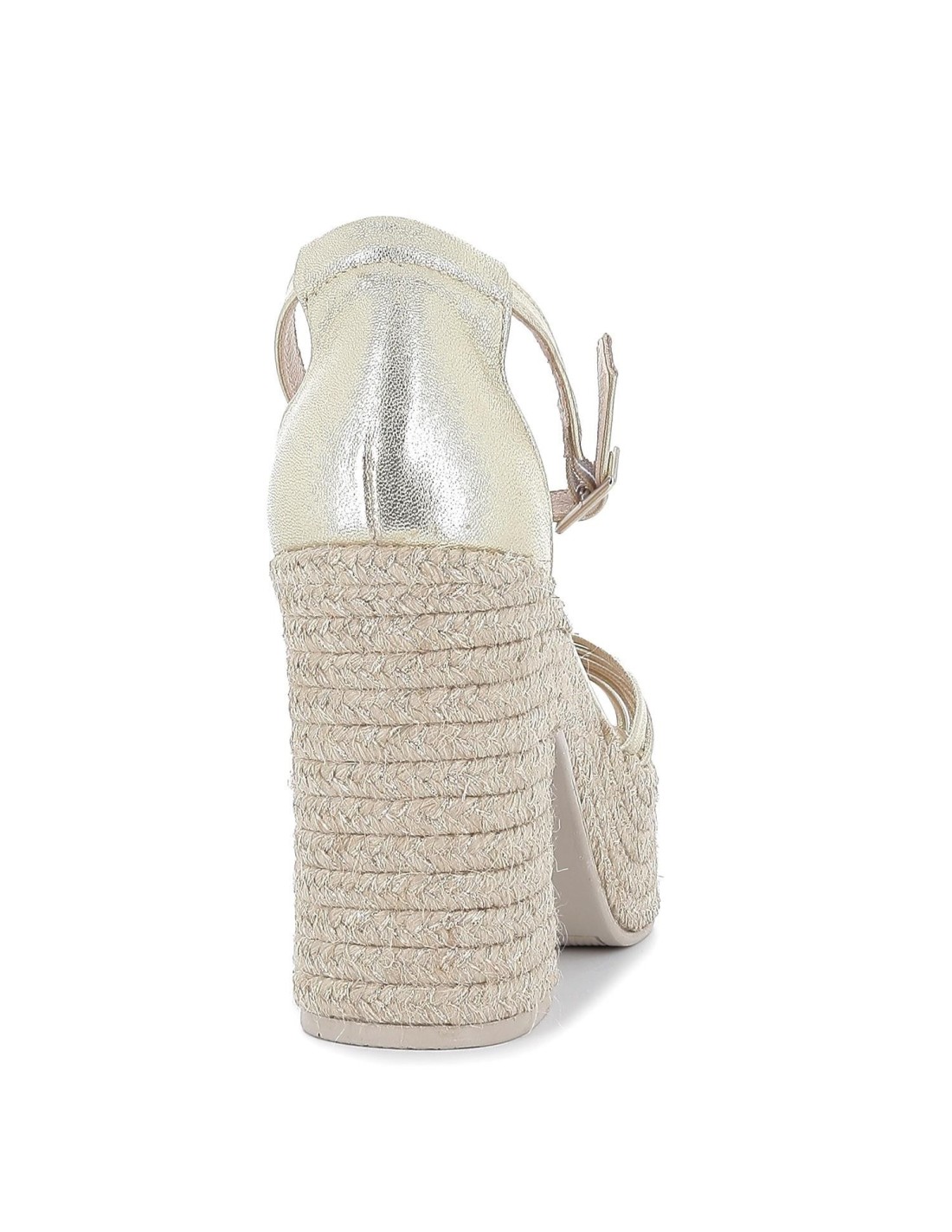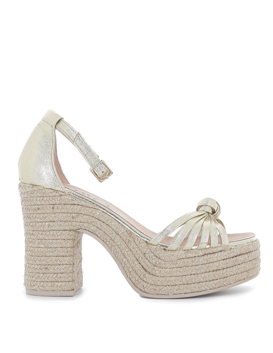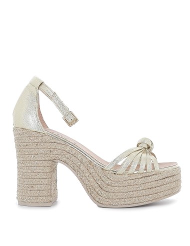 Sandalia nudo piel hebilla de cuña alta y yute ecológico dorado. Sandalia de puntera abierta fabricada en piel con diseño de tiras unidas en un nudeo en la pala y talón cerrado. Cierre mediante hebilla en el tobillo. Cuña alta fabricada en yute ecológico, unas cuñas cómodas y elegantes.