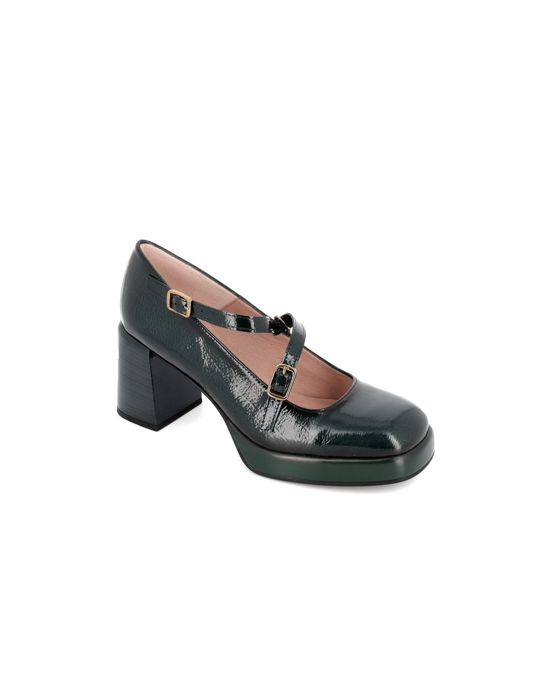 Merceditas charol verde hebilla y tacón mujer. Zapato tipo merceditas fabricadas en charol con horma cuadrada. Cierre mediante doble hebilla asimétrica. Suela con plataforma de 2 cm y tacón de 8cm de altura. Unos zapatos perfectos para cualquier ocasión.
