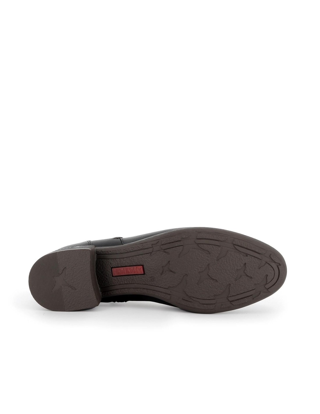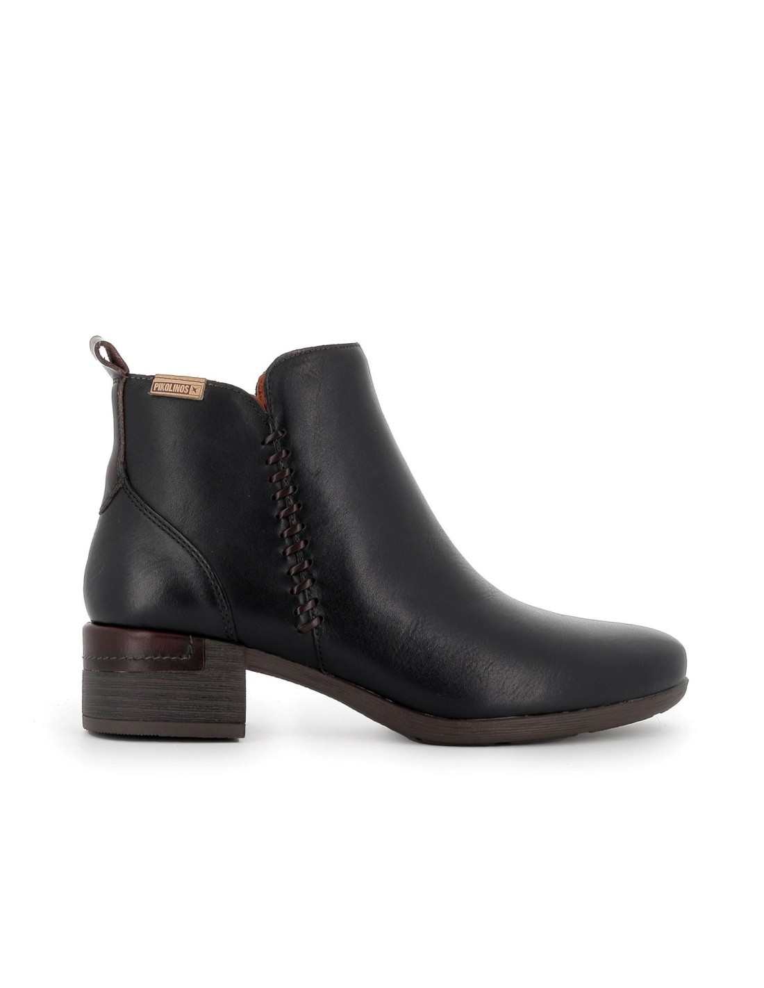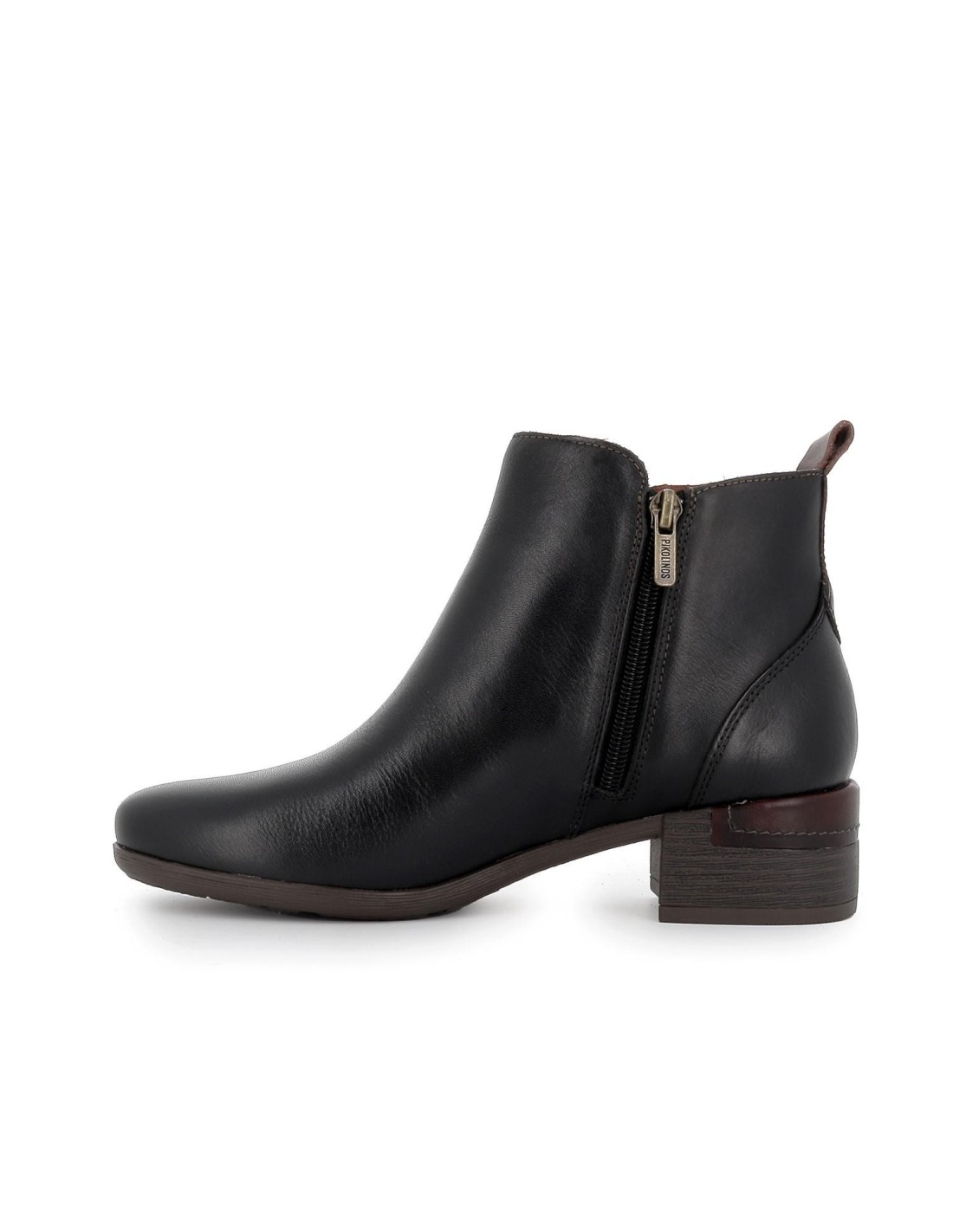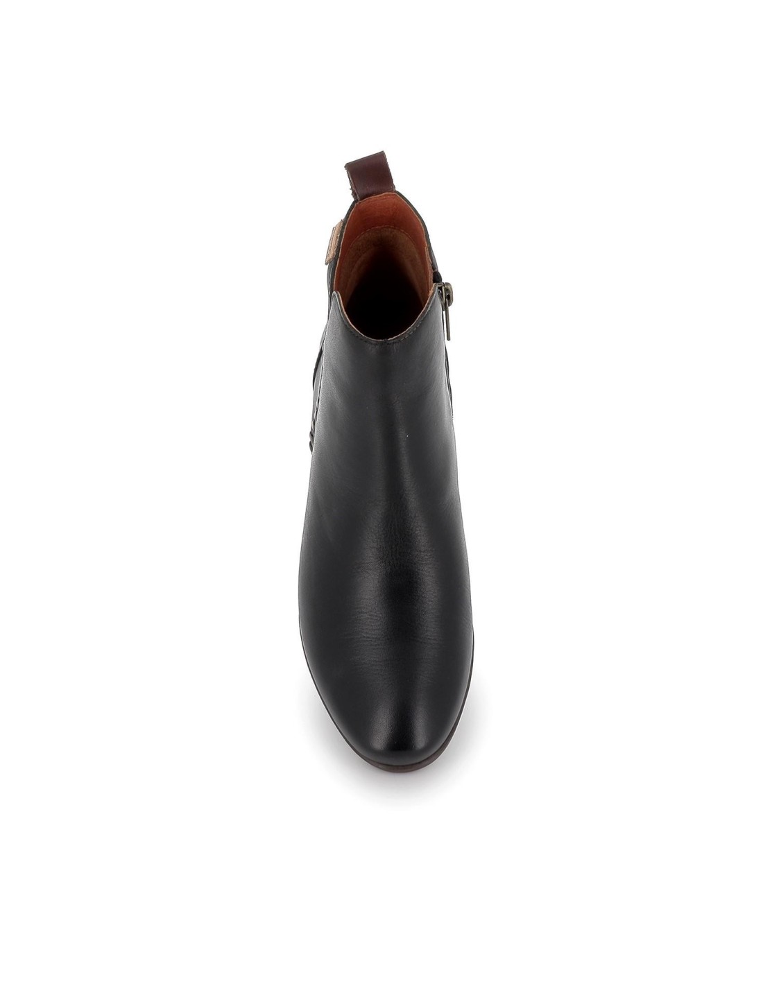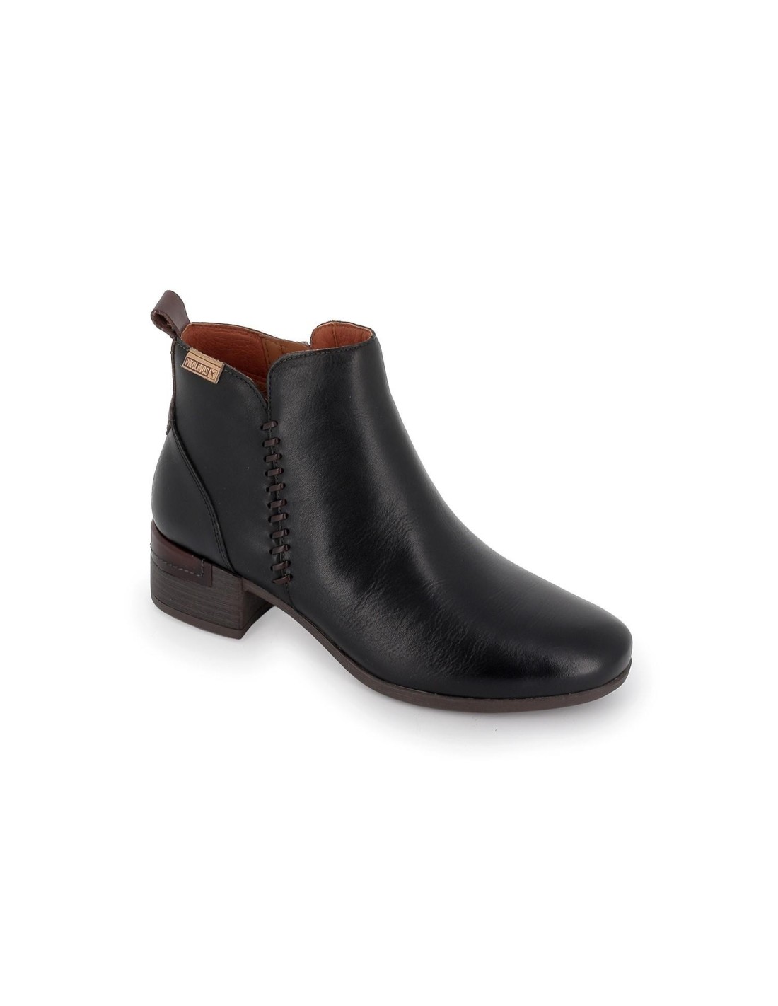 Botín tacón bajo piel lisa negra mujer. Botín para mujer fabricado en piel de calidad superior con cierre mediente cremallera lateral. Forro textil transpirable y plantilla acolchada. Con detalle pespuntes anchos. Suela de goma ligera y resistente efecto madera con tacón bajo.