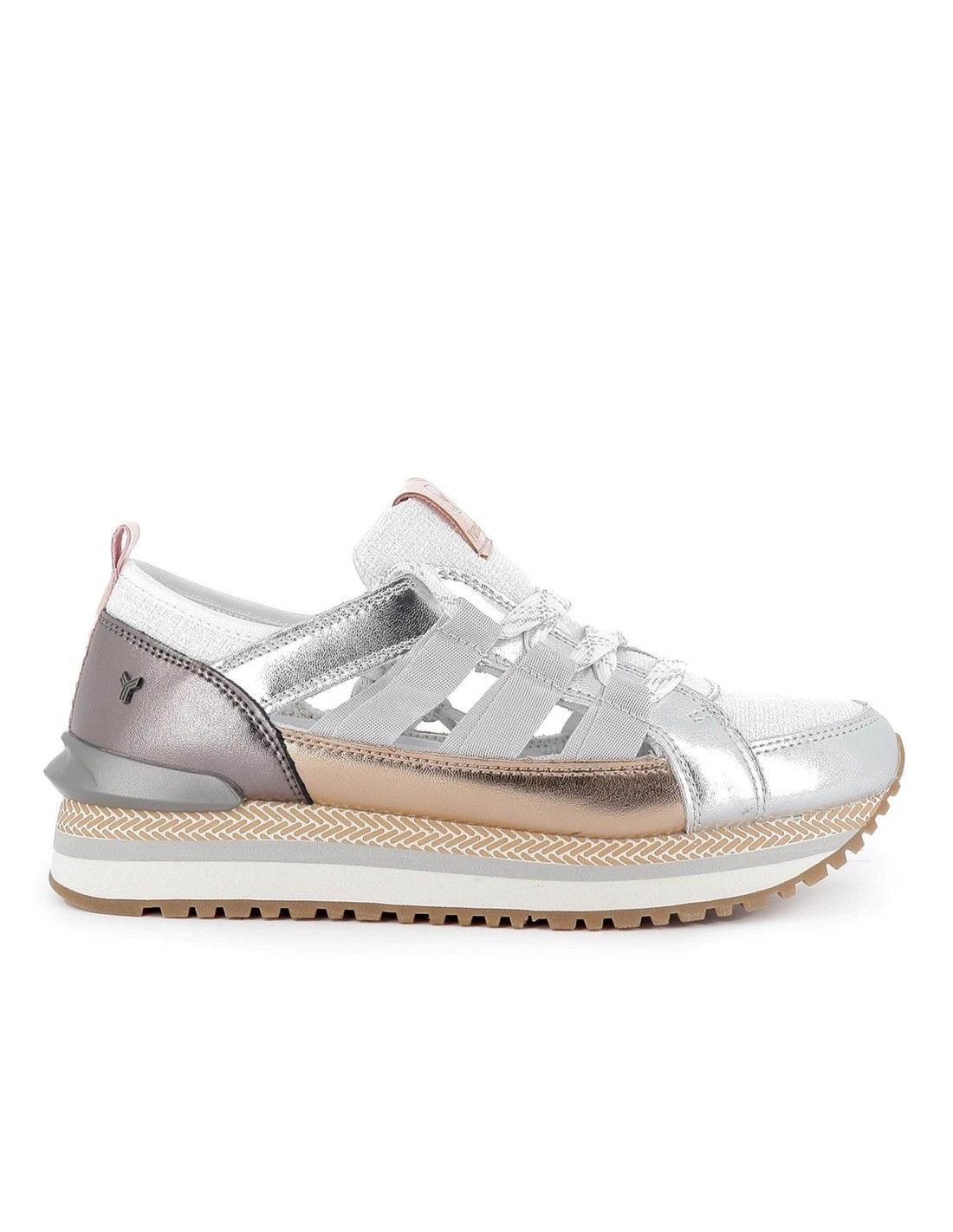 Deportiva piel con cintas plataforma mujer plateada. Deportiva fabricado en piel en diferentes tonos con cintas usadas a modo de cordones. Suela con plataforma detalle de bandeleta de rafia trenzada. Diseño cómodo, de calidad y a la moda. YUMAS es una marca legendaria de zapatillas deportivas. Sus más de 35 años los avalan como unos expertos en este tipo de calzado. ¿Has tenido alguna vez unas Yumas? Seguro que sí. Sus modelos inconfundibles llenaron nuestros armarios, y lo seguirán haciendo muchos más años.