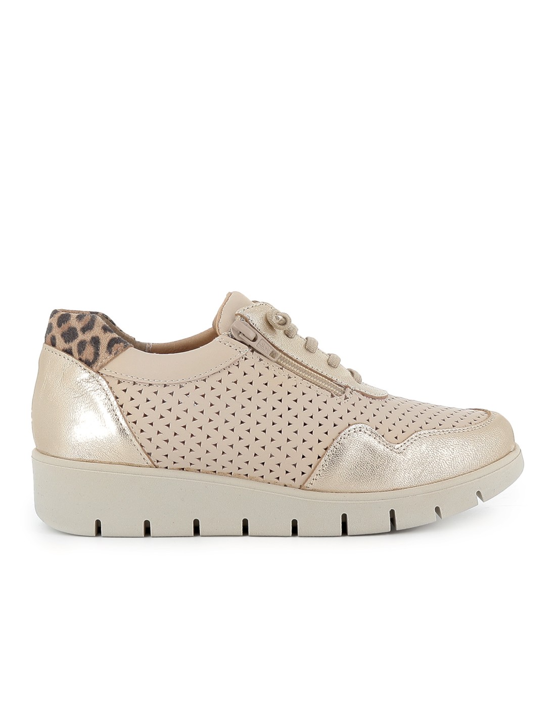 Deportivas piel troquelada con elasticos y cremallera mujer beige. Deporte fabricados en piel combinada con detalle troquelado y cierre mediante cordones elasticos y cremallera lateral para mejor ajuste. Diseño de talon leopardo como contraste. Incluye plantilla con almohadillada extraíble. La suela de cuña es de goma antideslizante. Chamby es una marca con fabricación y diseño en España que se centra en el uso de las pieles como principal material en sus creaciones. La versatilidad es el emblema de esta marca que no se limita a ningún estilo concreto. Sea cual sea tu objetivo, Chamby tiene el zapato perfecto para ti.