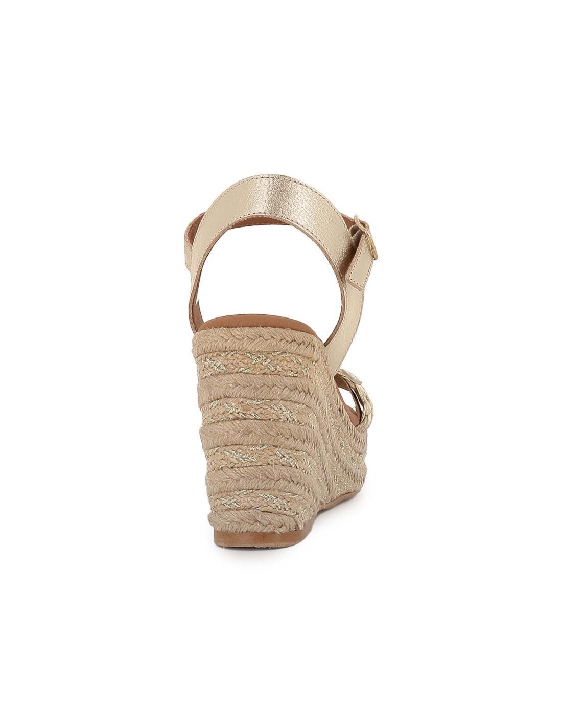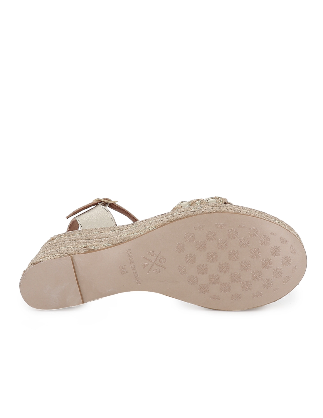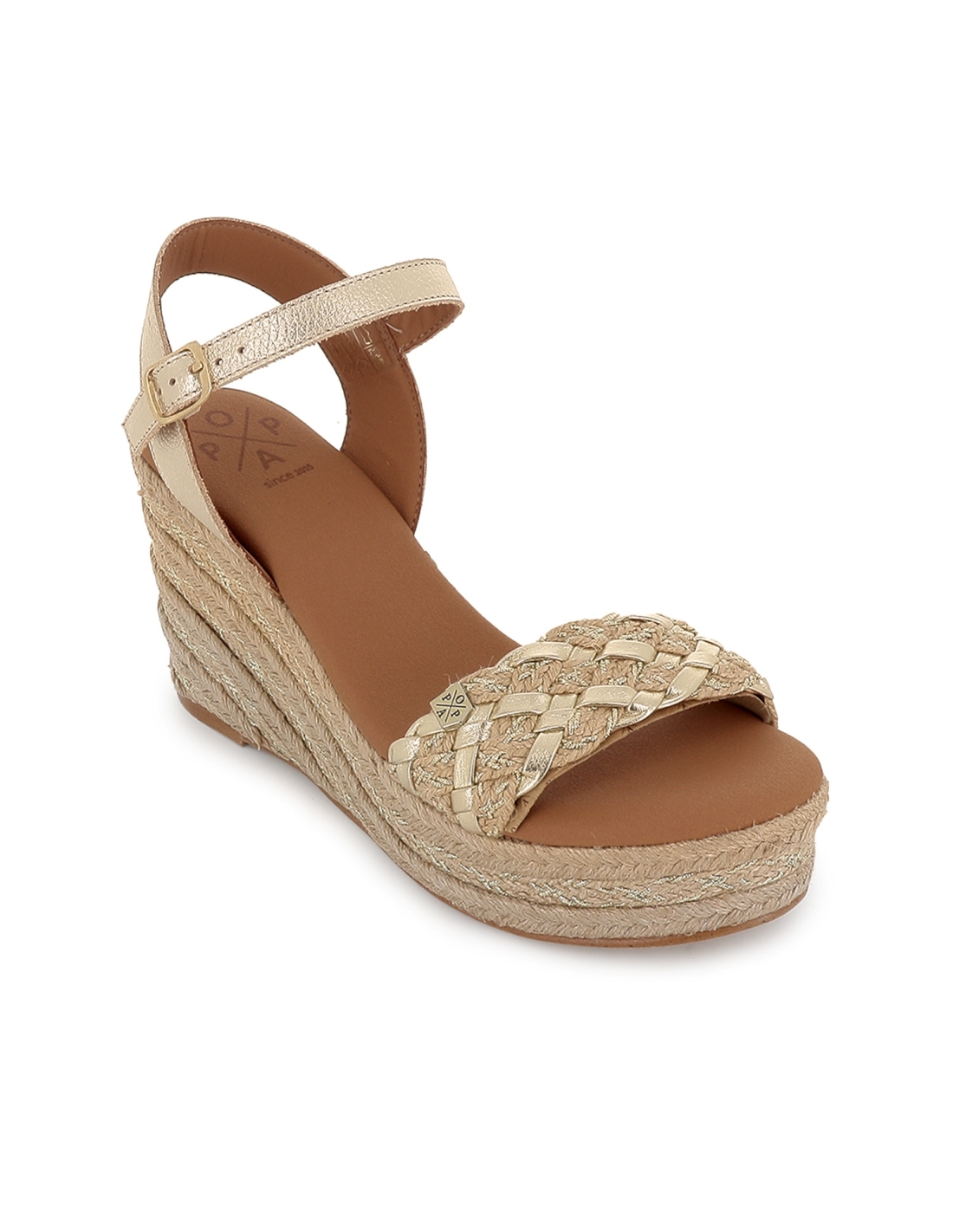 Alpargata yute con bandeleta piel lisa cuña mujer dorada. Alpargata yute fabricada en piel lisa con diseño de bandeleta en la pala y cierre mediante hebilla en el tobillo. Cuña con plataforma, un clasico que no falla. Popa es una marca de fabricacion española que destaca por el uso de piel relacionado con una moda confortable. Esta marca que se renueva constantemente, adaptandose así a las tendencias sin perder su esencia cautivadora tan caracteristica.