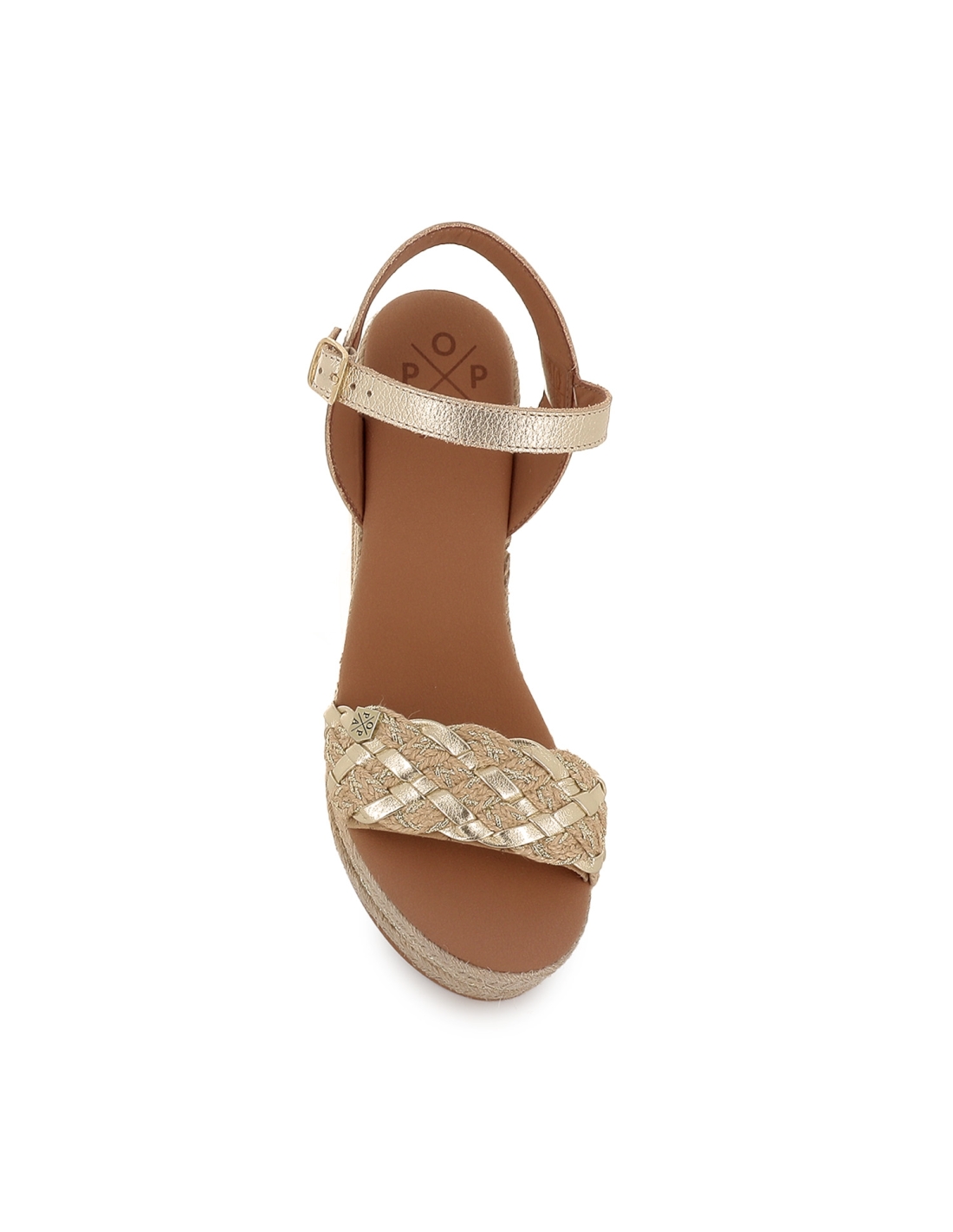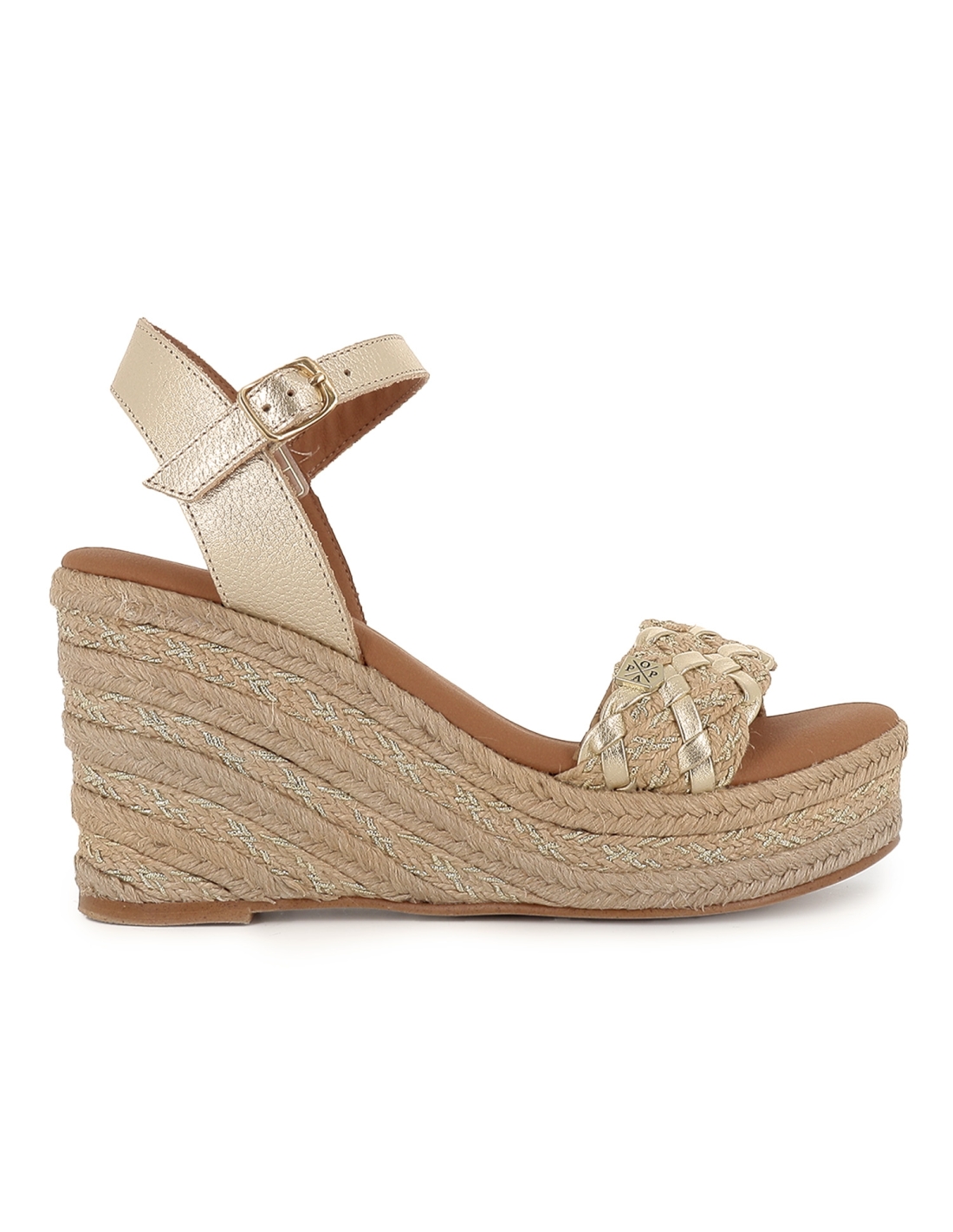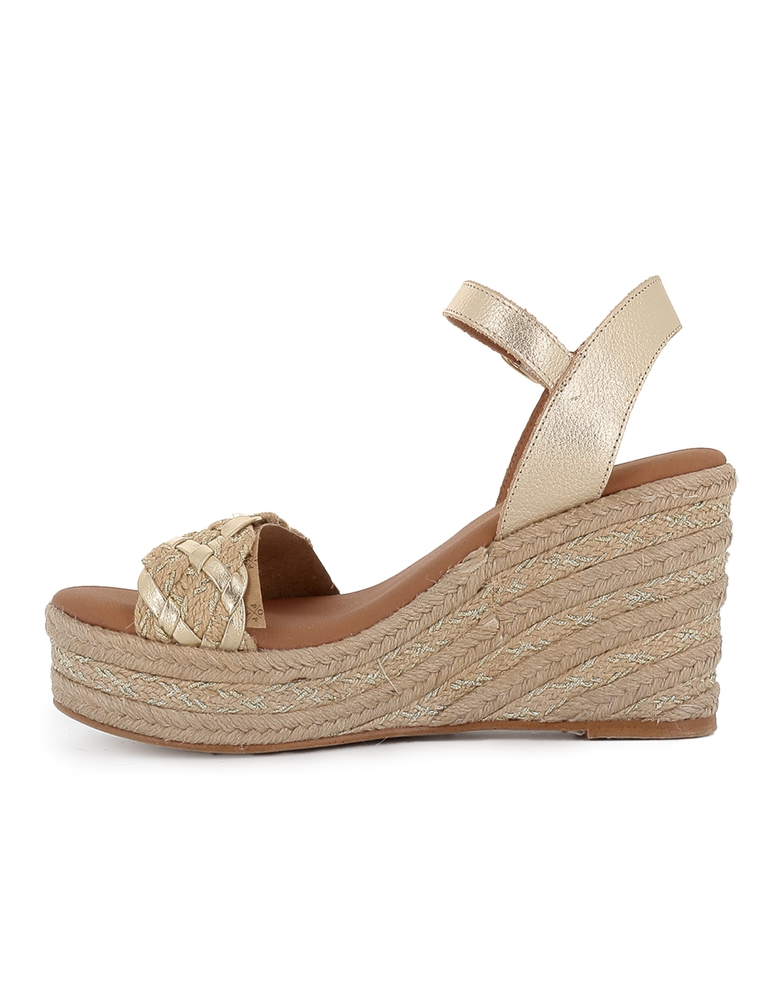 Alpargata yute con bandeleta piel lisa cuña mujer dorada. Alpargata yute fabricada en piel lisa con diseño de bandeleta en la pala y cierre mediante hebilla en el tobillo. Cuña con plataforma, un clasico que no falla. Popa es una marca de fabricacion española que destaca por el uso de piel relacionado con una moda confortable. Esta marca que se renueva constantemente, adaptandose así a las tendencias sin perder su esencia cautivadora tan caracteristica.