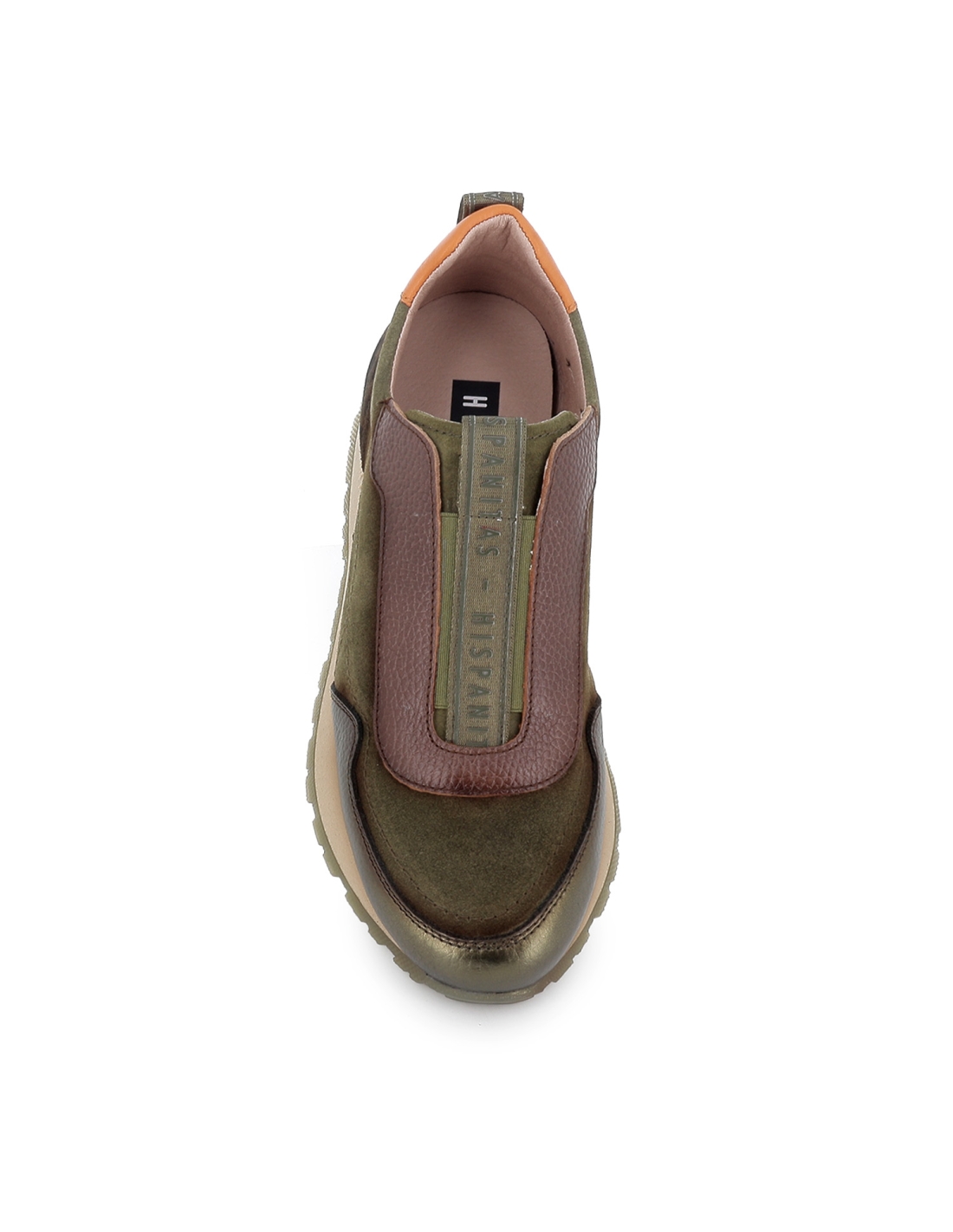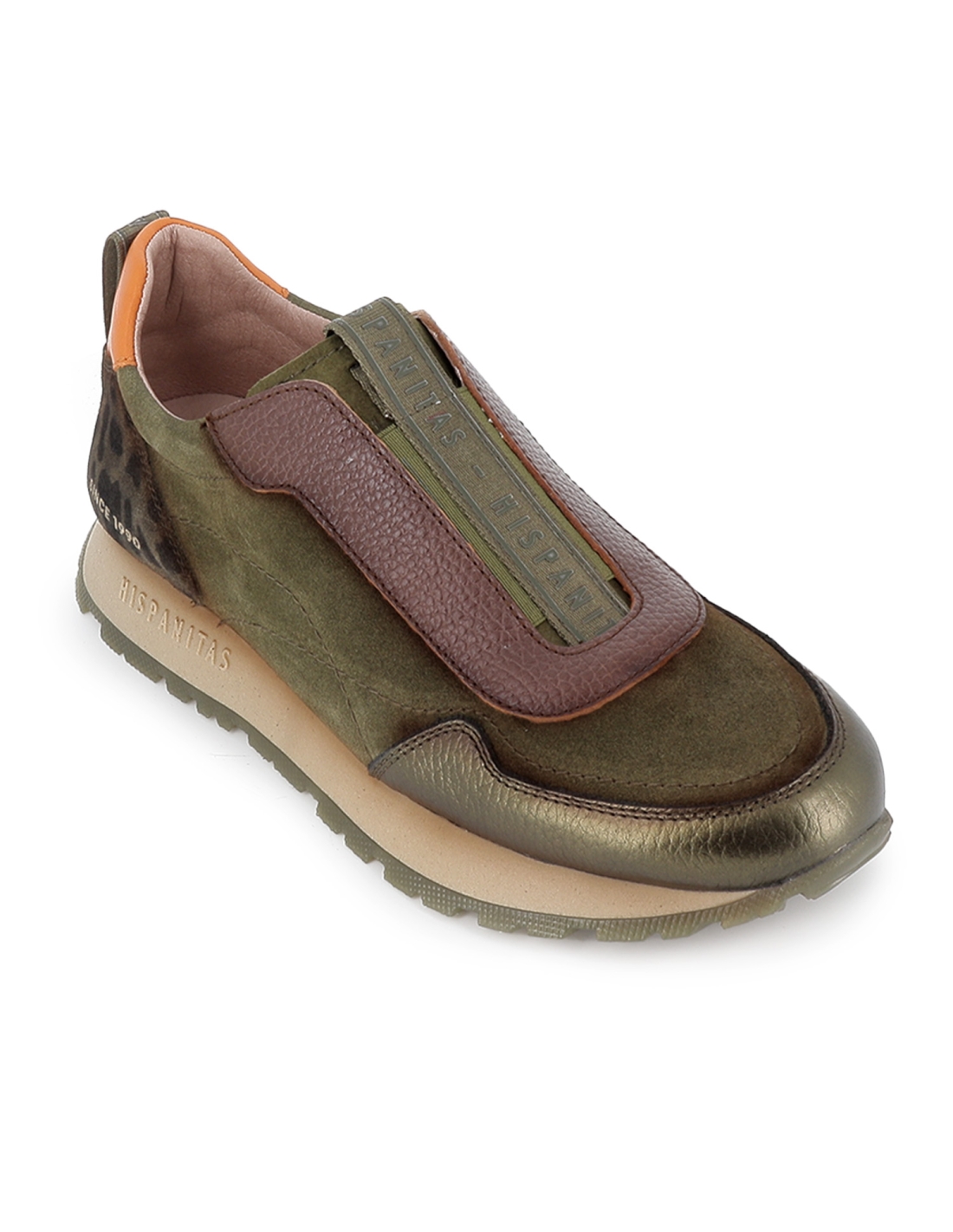 Deportivo elastico piel y serraje print animal talon mujer verde. Deportivas fabricadas en piel y serraje con diseño print animal leopardo en el talon mujer y ajuste mediante elasticos en el empeine. Piso confortable plano con 3,5 cm de altura con suela acolchada y extraible. Un básico que no te querrás quitar esta temporada. HISPANITAS es una marca española cuya fabricación es 100% nacional defendiendo así el comercio local, que se enfoca especialmente en la sostenibilidad, que consigue a través de medidas de moda sostenible, y su compromiso es ayudar a que la sociedad sea más justa.