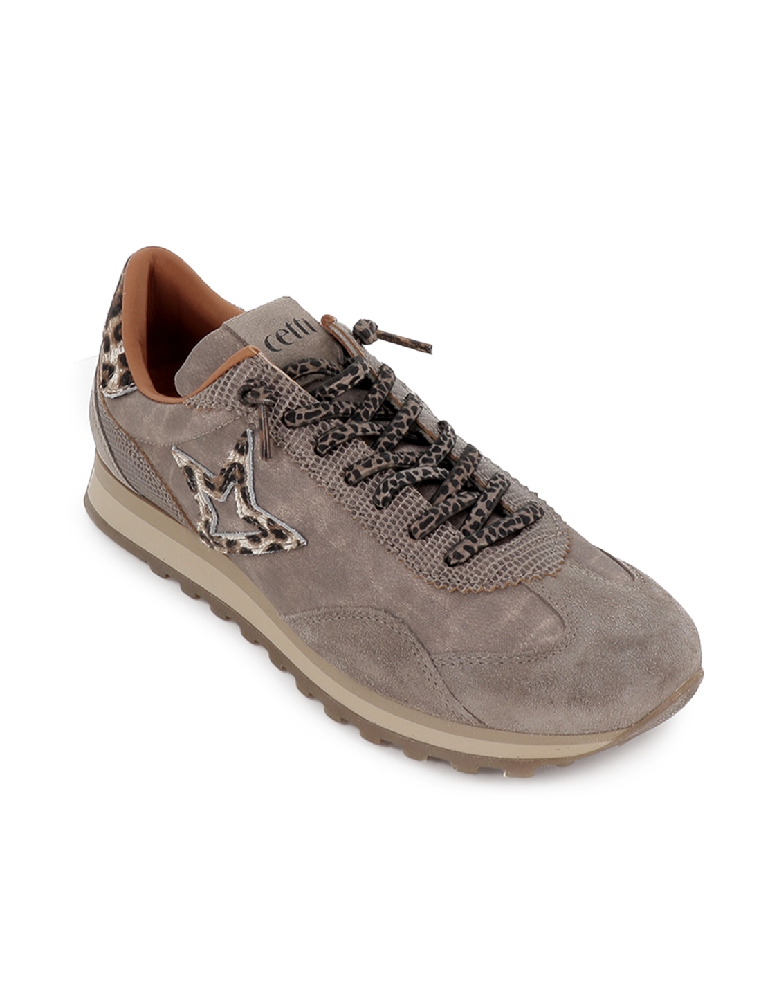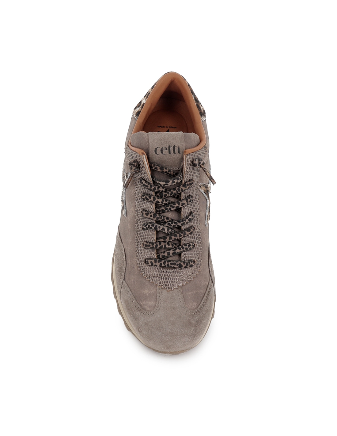 Deportivos piel y serraje cordones elasticos mujer marron. Zapato tipo deportivo fabricado en piel lisa combinado con serraje con detalle en talon y logo lateral en print animal. Suela de goma bicolor con tacón ancho. Plantilla extraible. Cierre cordones elasticos. Calzado cómodo perfectos para todos los días, un MUST en tu armario. CETTI es una marca de calzado que diseña y fabrica 100 % en España. Zapatos y zapatillas de corte urbano para mujer y hombre que destacan por su creatividad, dinamismo, tendencia y estilo propio. Zapatos que combinan estampados, texturas y materiales de la mejor calidad para dar un resultado único y que marque la diferencia cada temporada, que sean cómodos, ligeros, de calidad y, en definitiva, que te encanten.