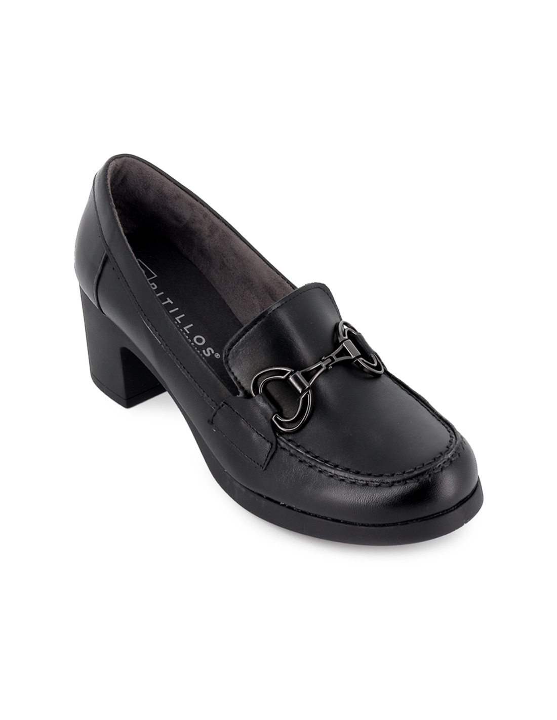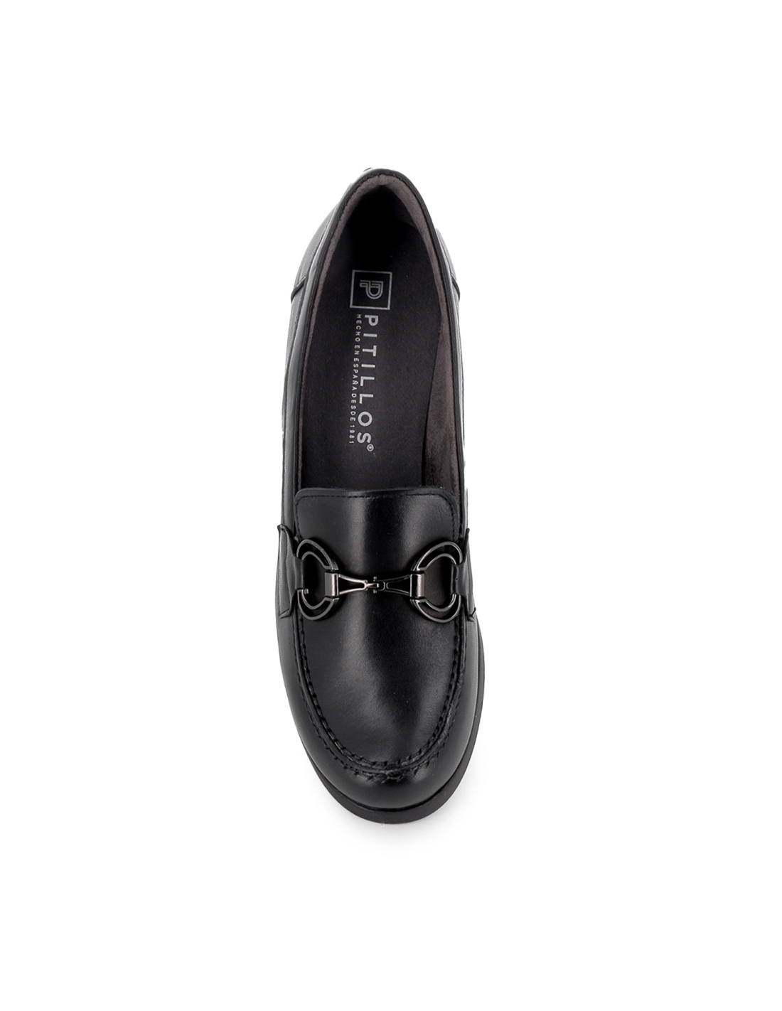 Mocasin piel napa tacon medio hebilla metal mujer negro. Zapato tipo mocasin fabricado en piel napa y detalle hebilla sobre el empeine. Suela de goma con tacon de altura media y ancho. Estos mocasines incluyen plantilla acolchada. Es un zapato con el que seras el centro de atencion sin perder en comodidad. PITILLOS es una marca que diseña y fabrica calzado 100% en España de la más alta calidad. Sus zapatos ligeros y flexibles siempre satisfacen las necesidades de los pies más exigentes y delicados, y cuentan con un gran variedad de estilos, desde aquellos para vestir hasta los más informales. Pitillos es calidad, fabricación nacional, elegancia y variedad.
