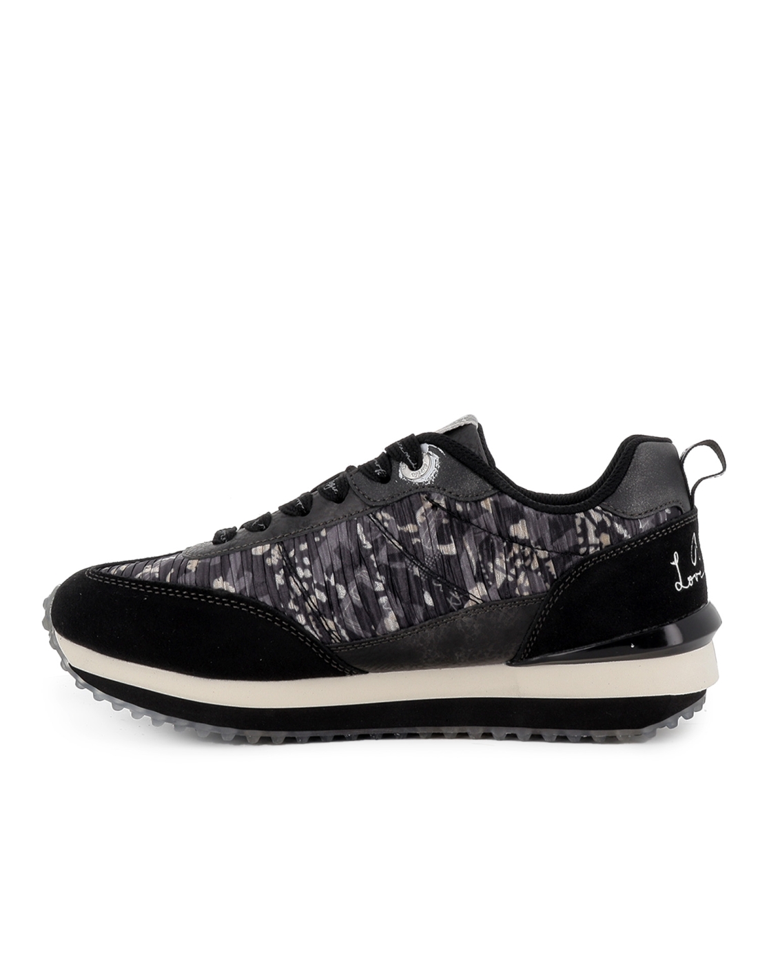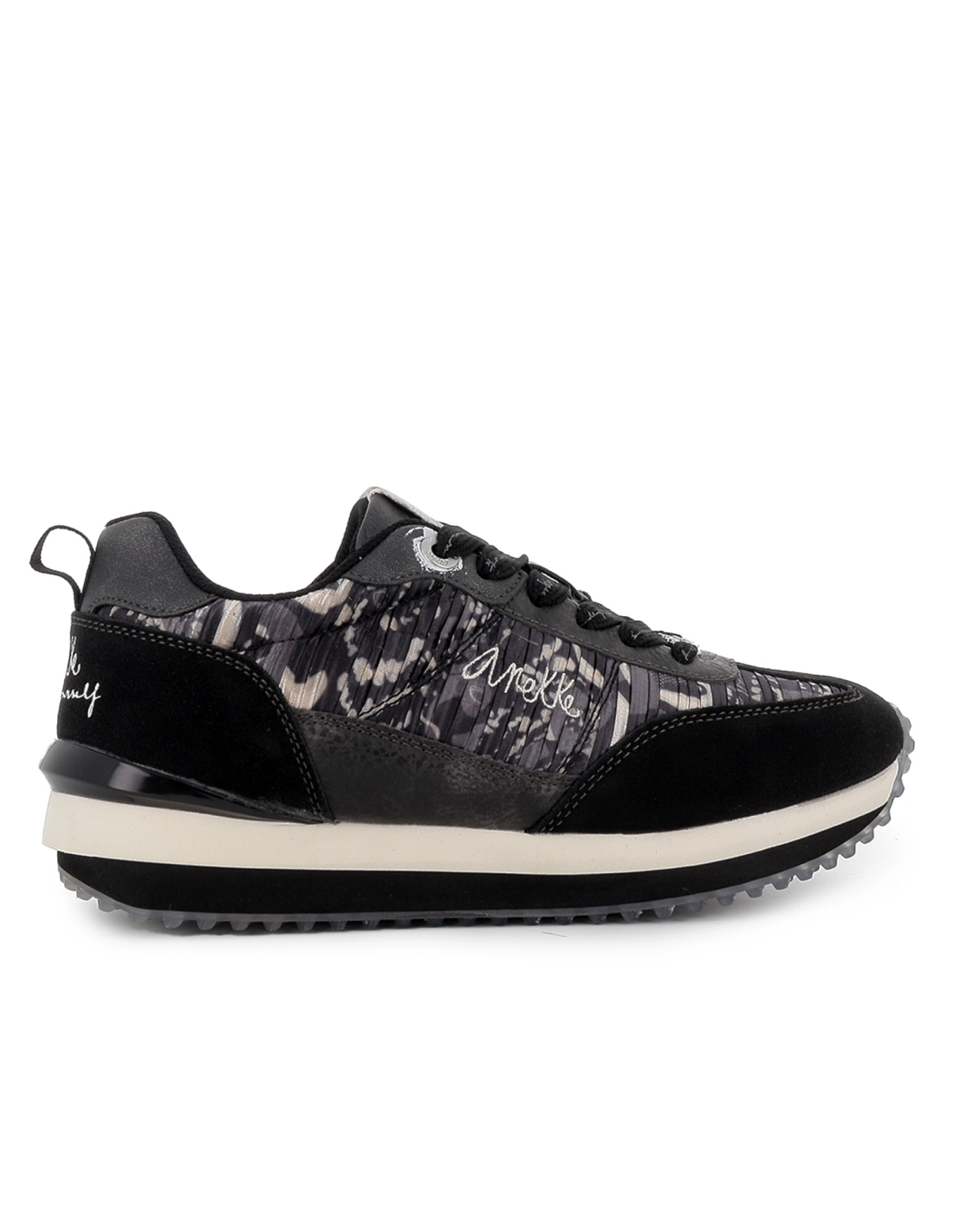 Deportiva textil fantasia plantilla extraible mujer negra. Deportivas fabricada en textil fantasia diseño muy original, logo lateral y cierre mediante cordones. Incluye calcetines al tono. Suela de goma ligera bicolor con plantilla acolchada extraible. Perfectas para uso diario. Anekke es una marca nacida en Alicante que destaca por sus diseño originales y estan especialmente pensados para las necesidades actuales de las mujeres. Se centra en linea de mujer, tanto calzado como complementos y buscan siempre un toque especial.