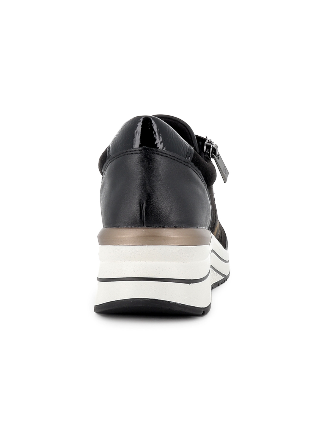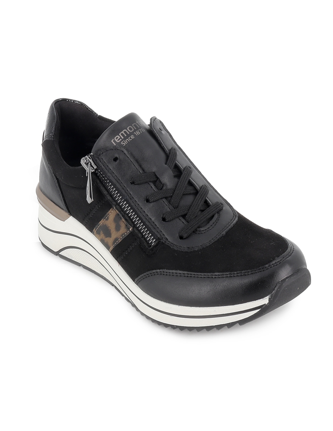 Deportiva piel cuña media cremallera mujer negro y leopardo. Deportiva fabricada en piel con detalle contraste en el lateral y cierre mediante cremallera y cordones. Suela de cuña media ultraligera. Zapatos en tendencias que no te querras quitar esta temporada. Además es perfecto para todo tipo de clima ya que su sistema TEX protege del viento, del frío y de la lluvia. Incluye plantilla acolchada y extraíble. Perfectos para los looks de diario. REMONTE es la línea más juvenil de RIEKER, una reconocida marca de calzado alemana que se especializa en zapatos cómodos que cuentan con una exclusiva tecnología anti-stress, es decir, que absorbe el impacto de la pisada. Calzado de gran calidad, cómodo y genuino.