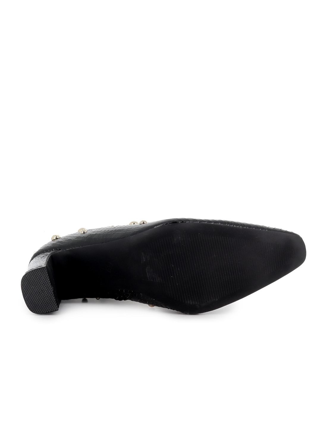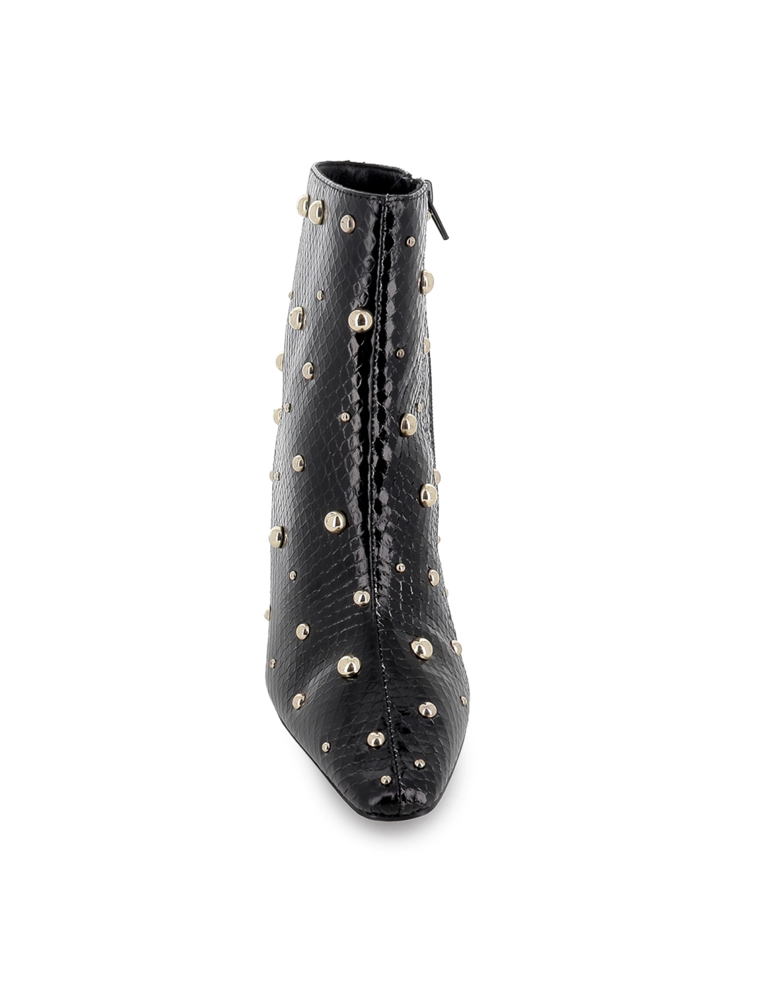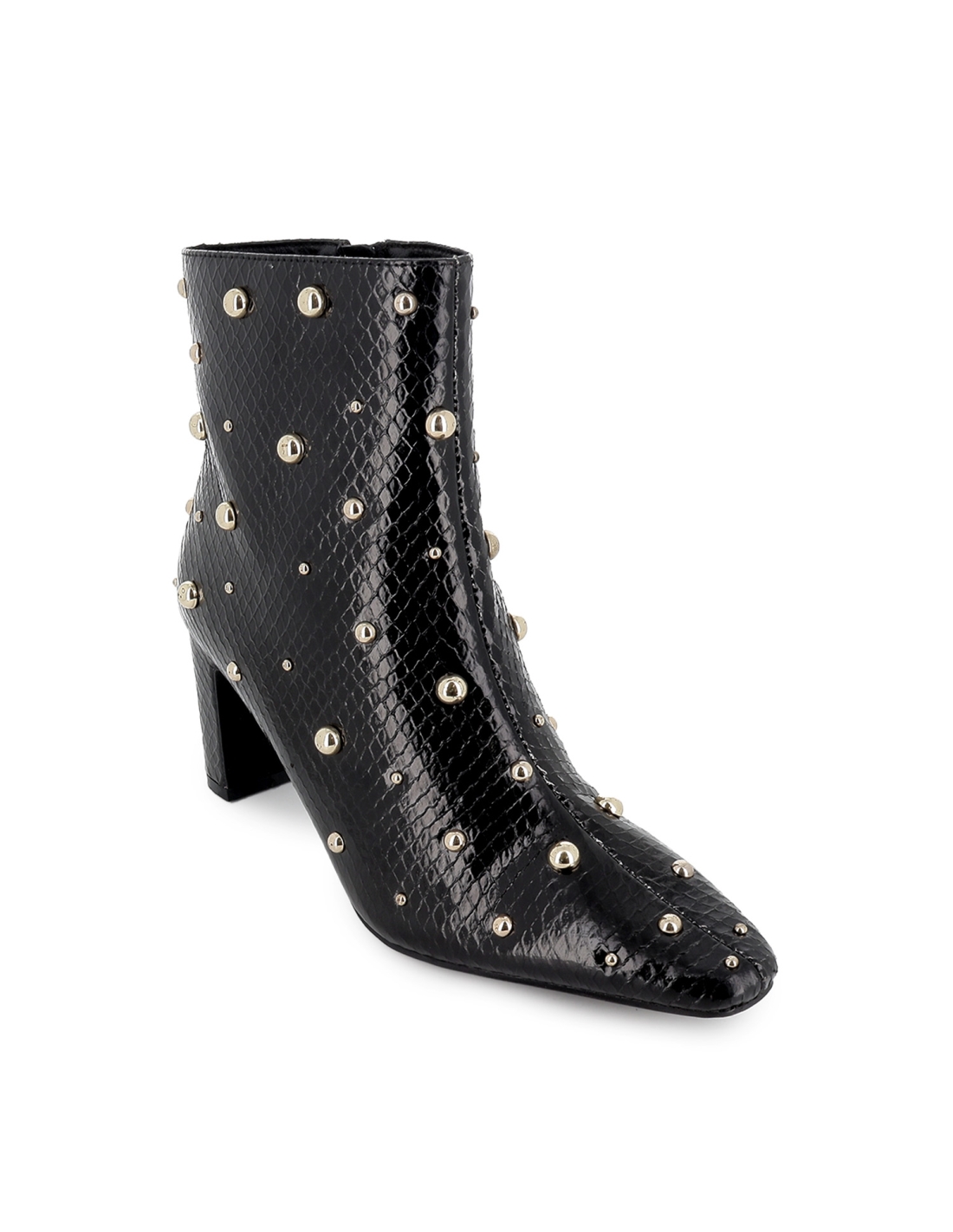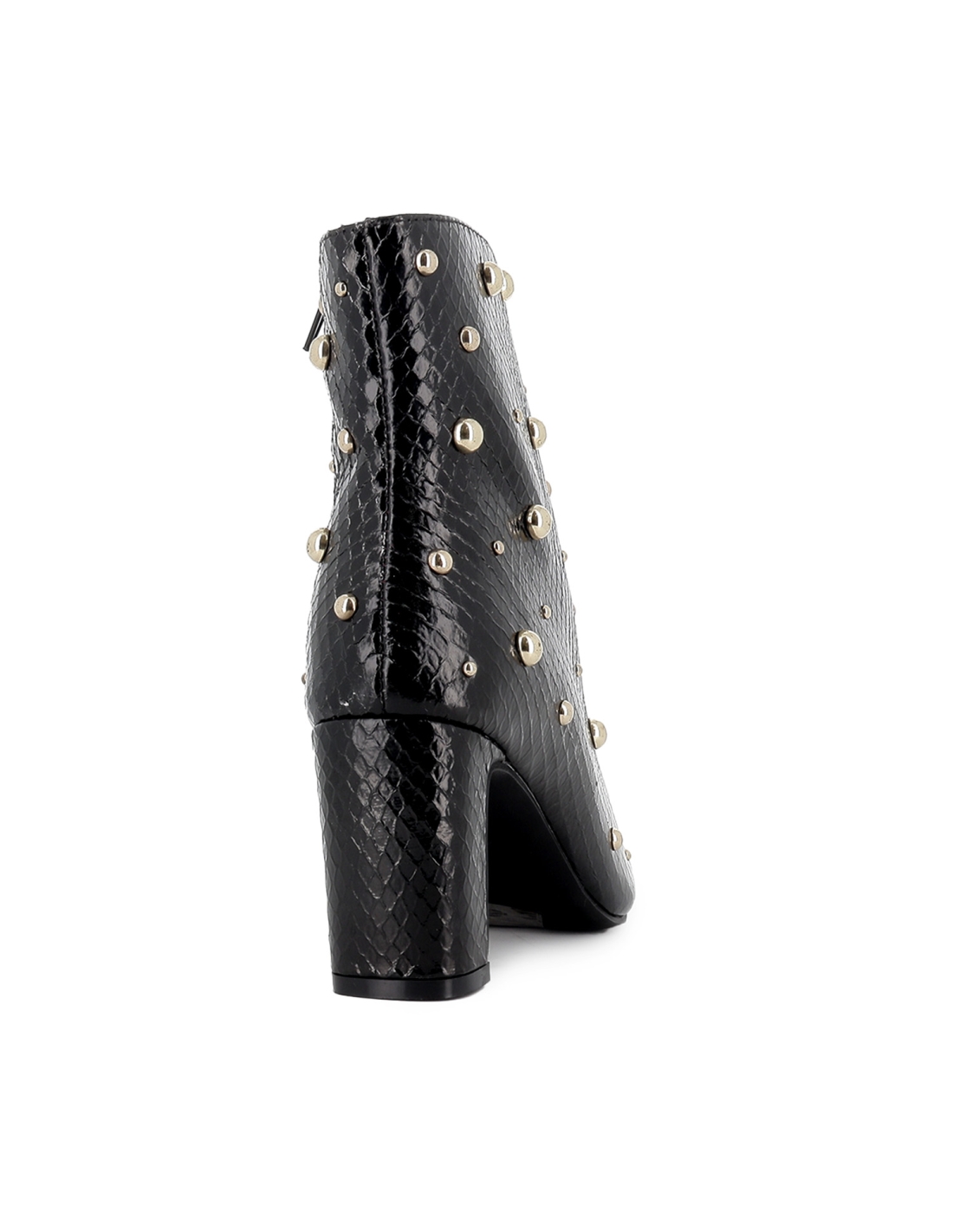 Botin remaches print serpiente tacon medio mujer negro. Botin fabricado en print serpiente con diseño de remaches de varios tamaños y tacon de altura media. Botin facilmente combinable y muy en tendencia esta temporada. LA STRADA es una marca española especializada en calzado joven y de carácter internacional. Materiales de calidad y diseños a la última definen sus fabricaciones.