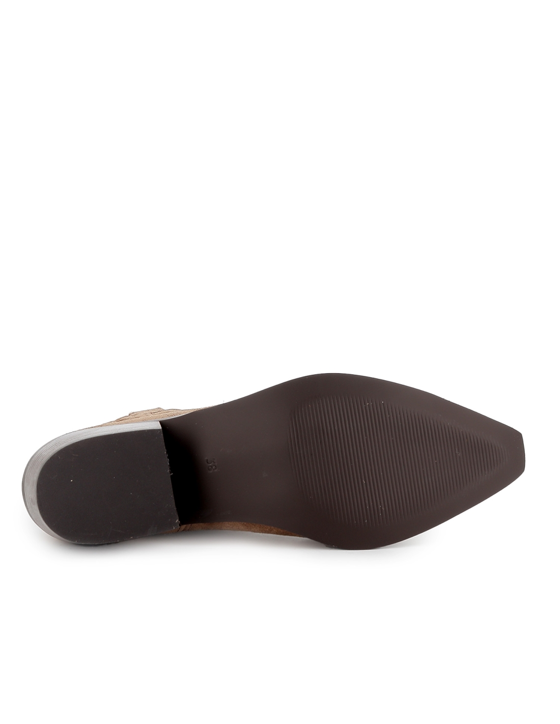 Botin tejana piel bordados tacon cubano mujer taupe. Botin tejana fabricada en piel serraje con detalle bordados en la caña y tacon cubano con puntera fina. Un botin tejano clasico para esta temporada. PEPE PARRA es una marca de calzado española. Especializado en calzado casual y de vestir para mujer, sus diseños combinan las últimas tendencias con materiales de gran calidad, como pieles naturales, plantillas acolchadas y de gel, o suelas de goma flexible, para que vayas perfecta y cómoda en cada ocasión con un zapato que destaca por su calidad, autenticidad y cuidado de los detalles.